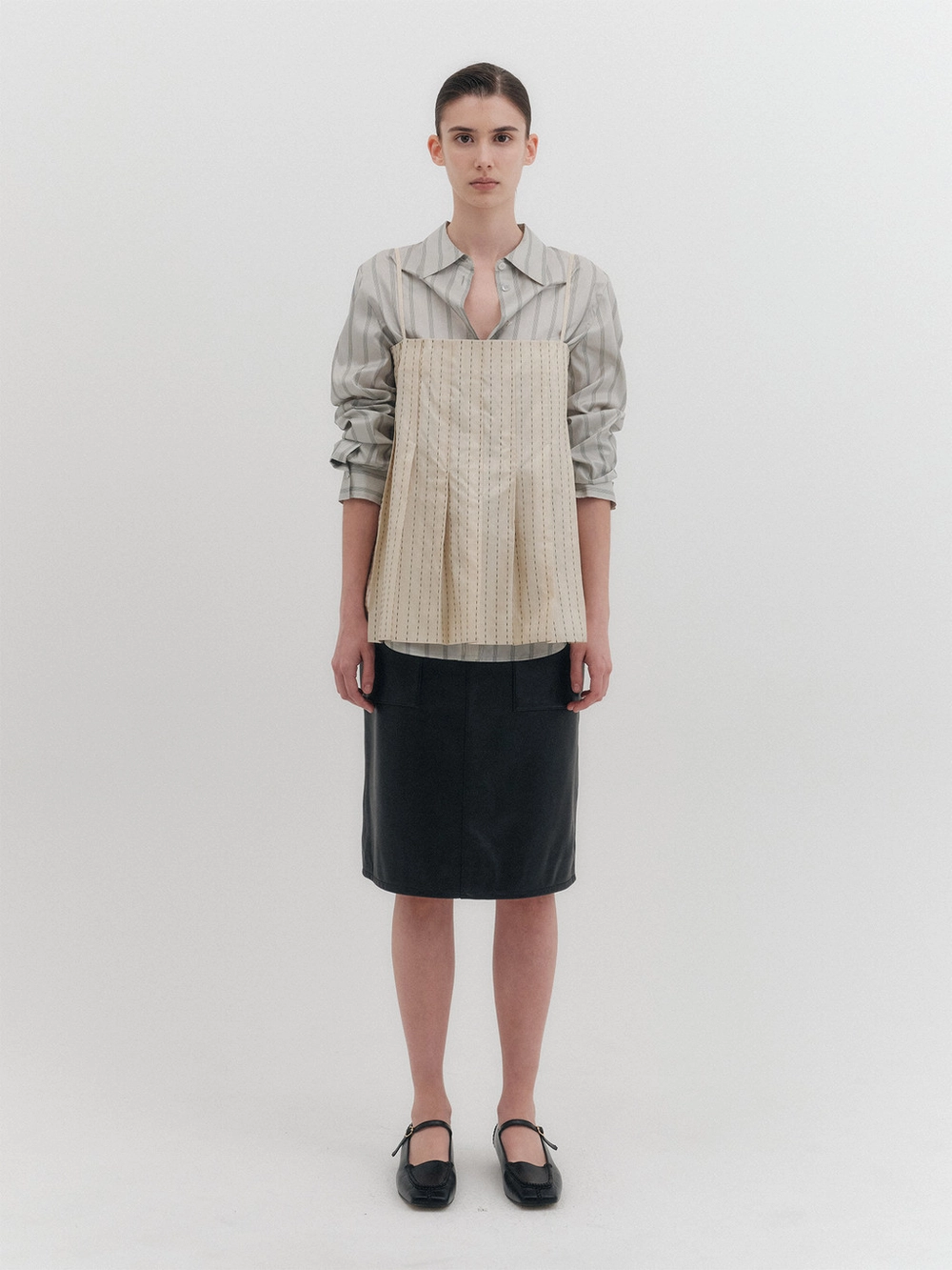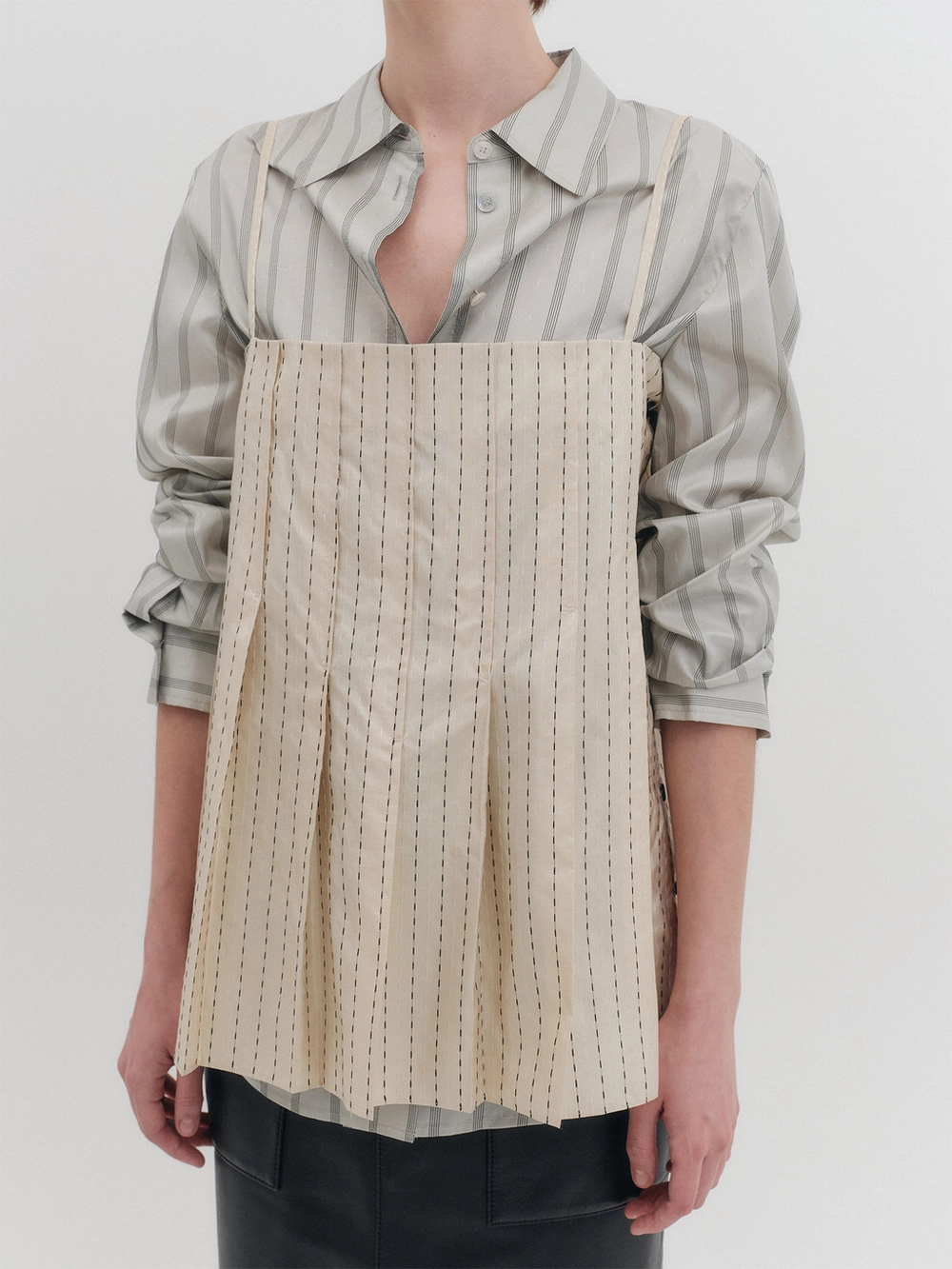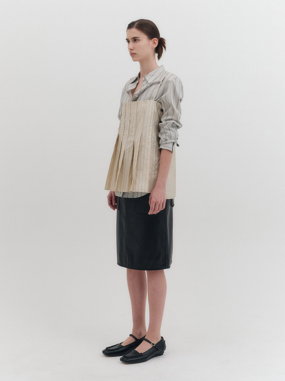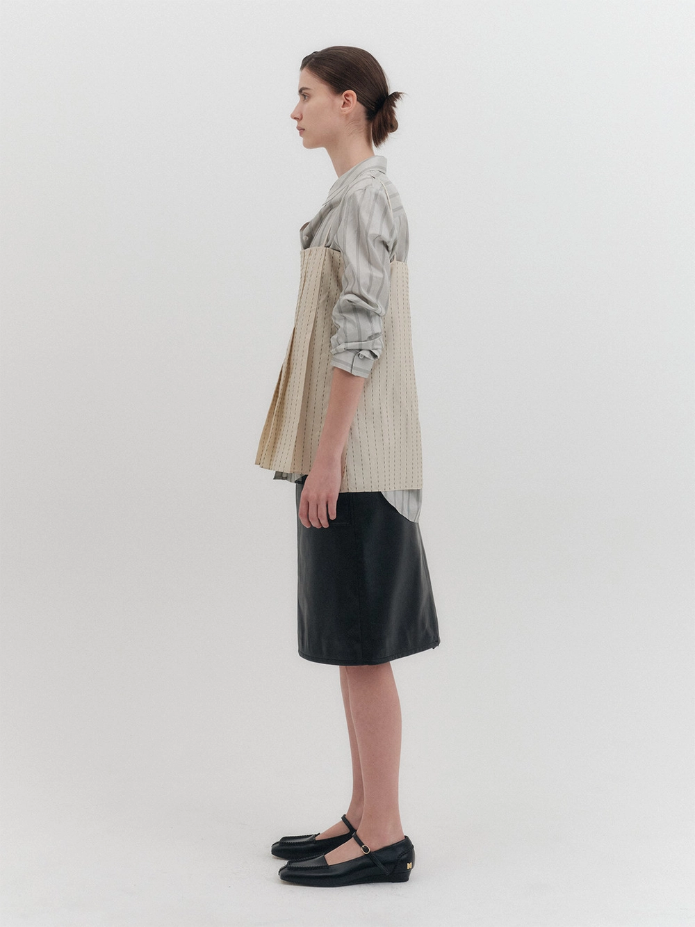 - Front seam and pleated details