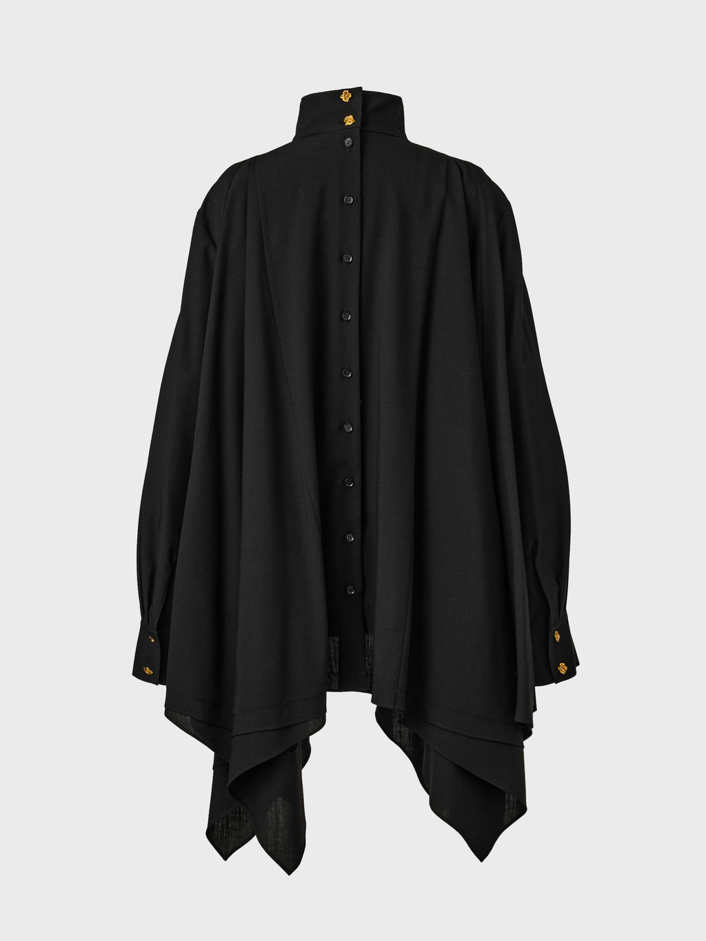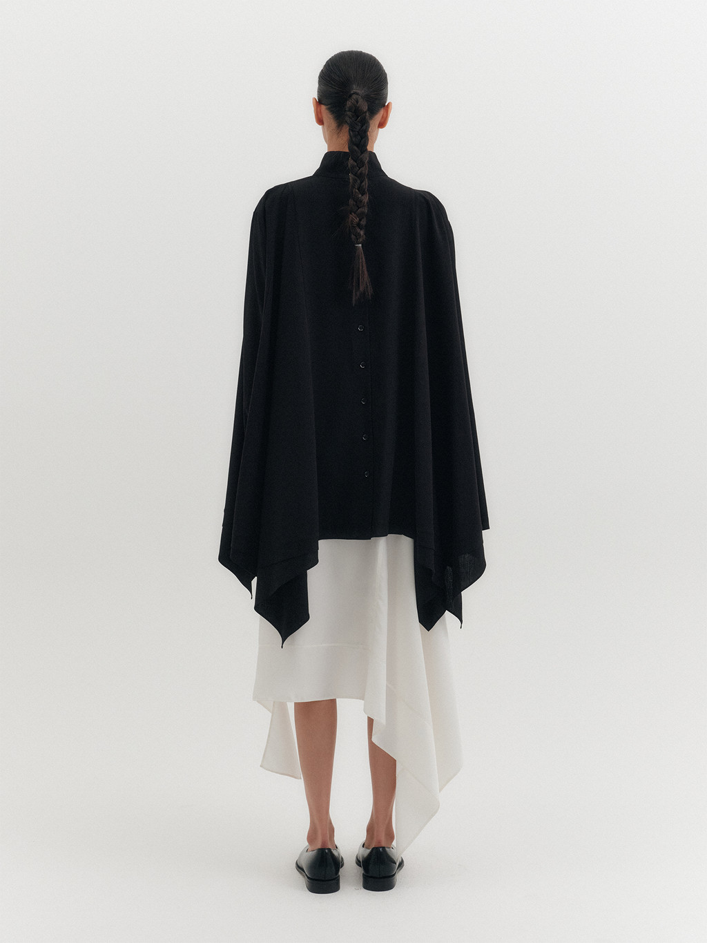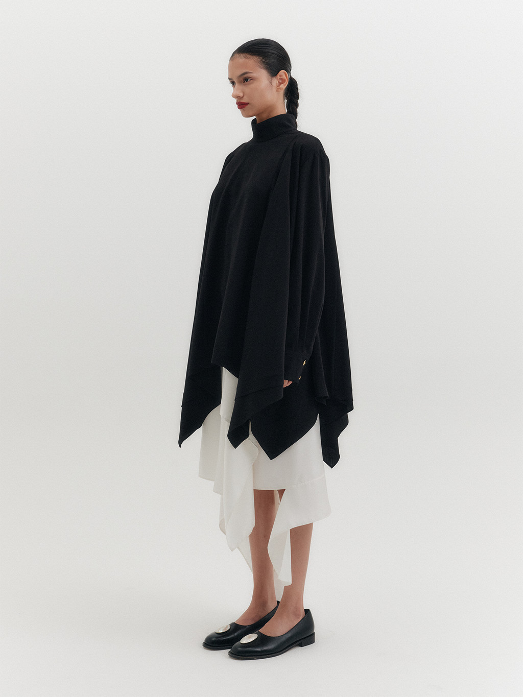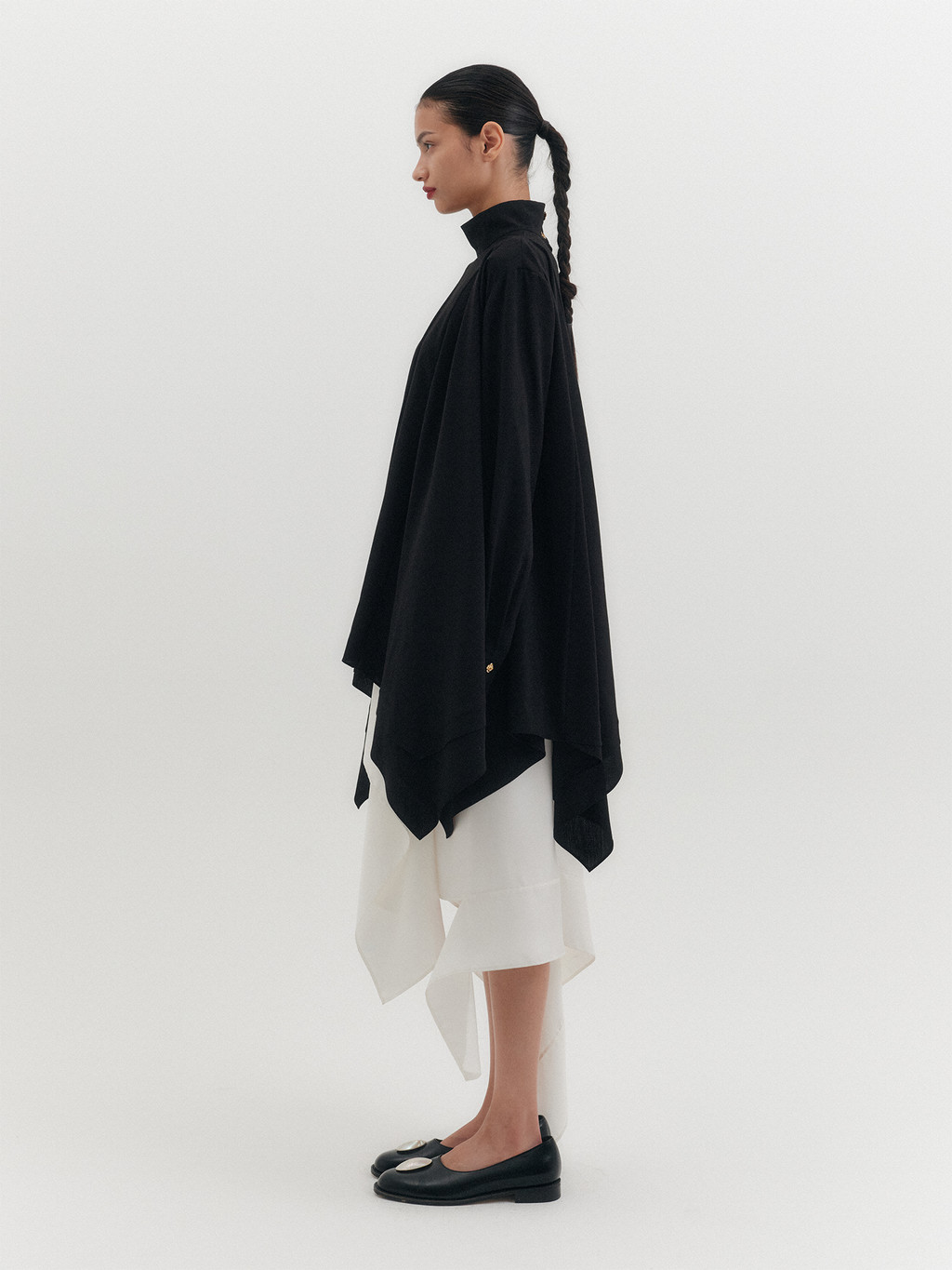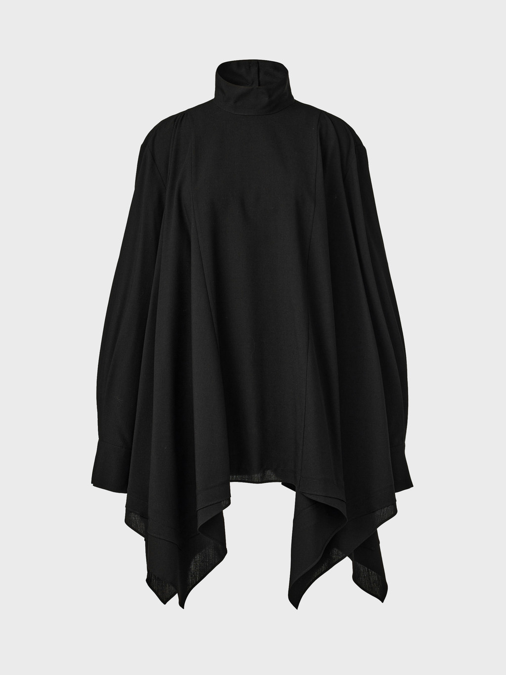 - High-neck design with asymmetrical hemline