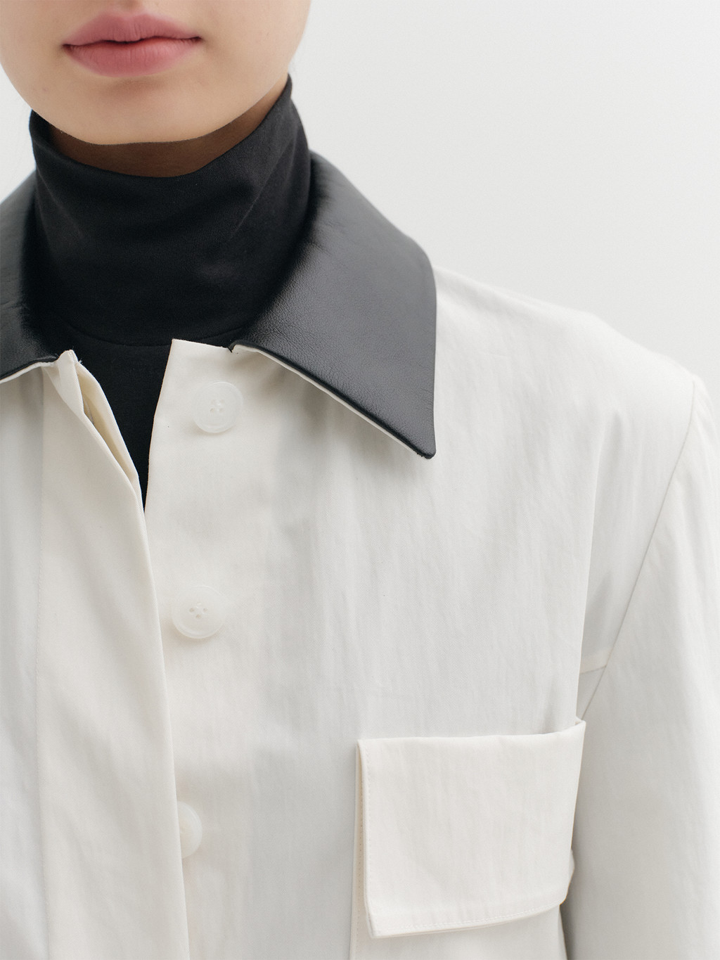 - Leather-contrast collar detail
