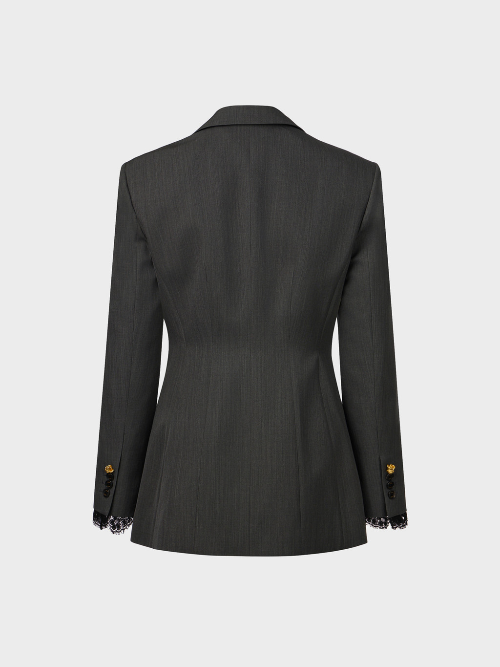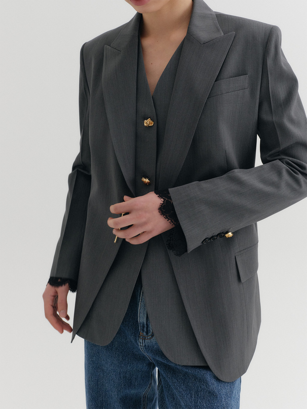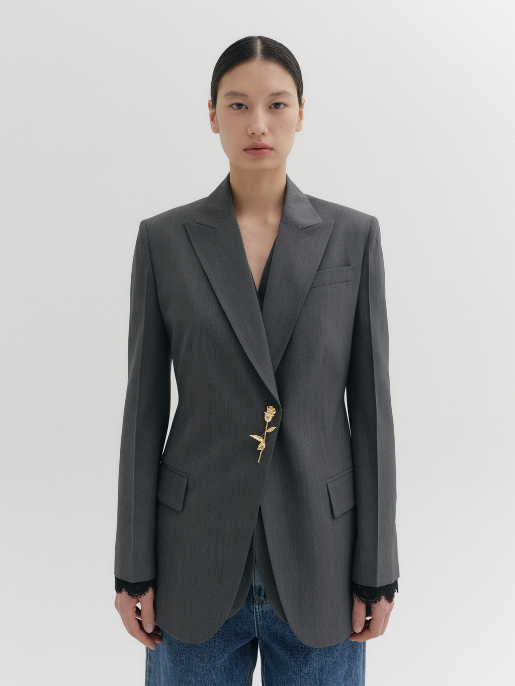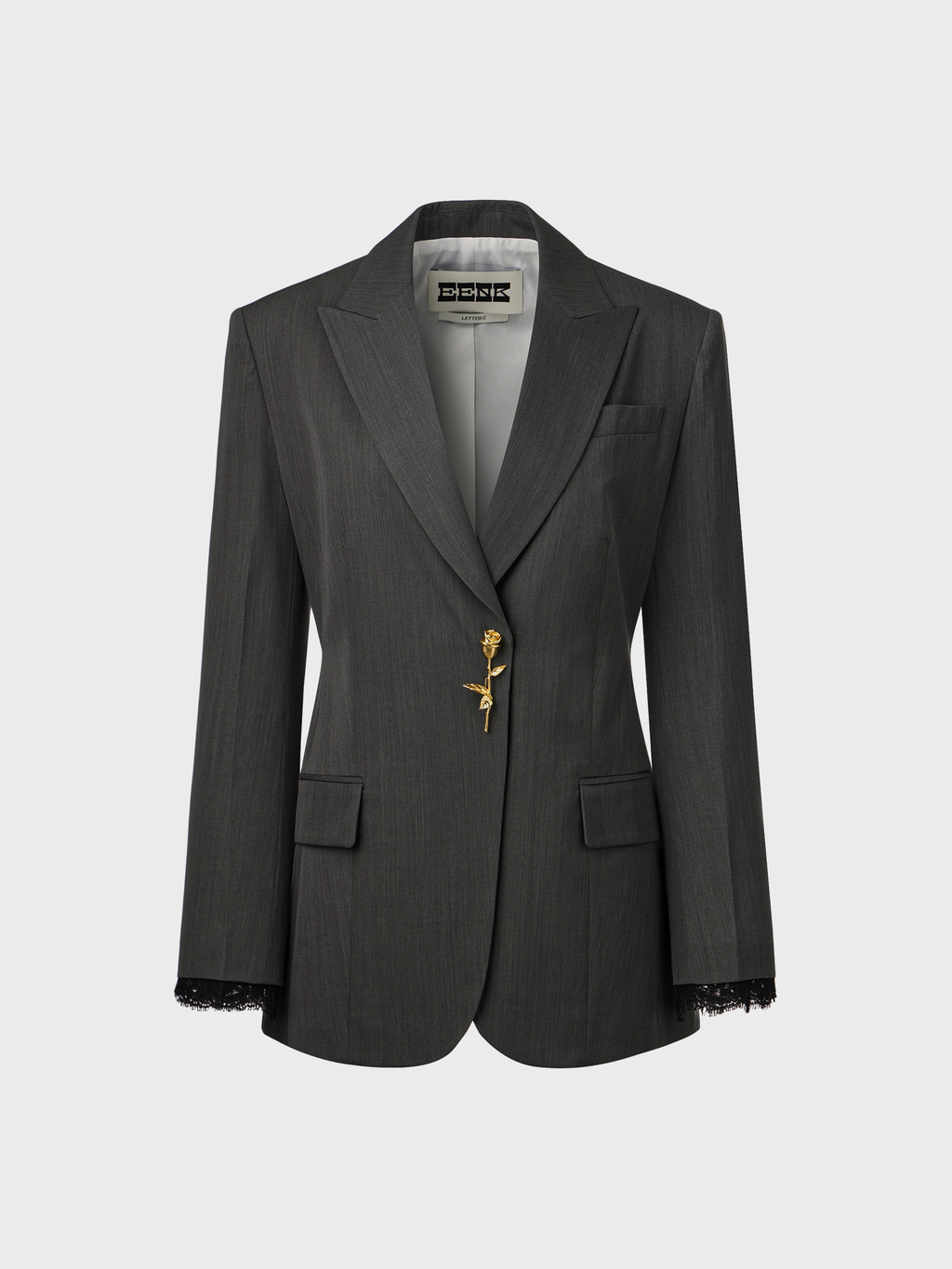 Lace Trim Blazer with Rose Brooch - GreyNEW