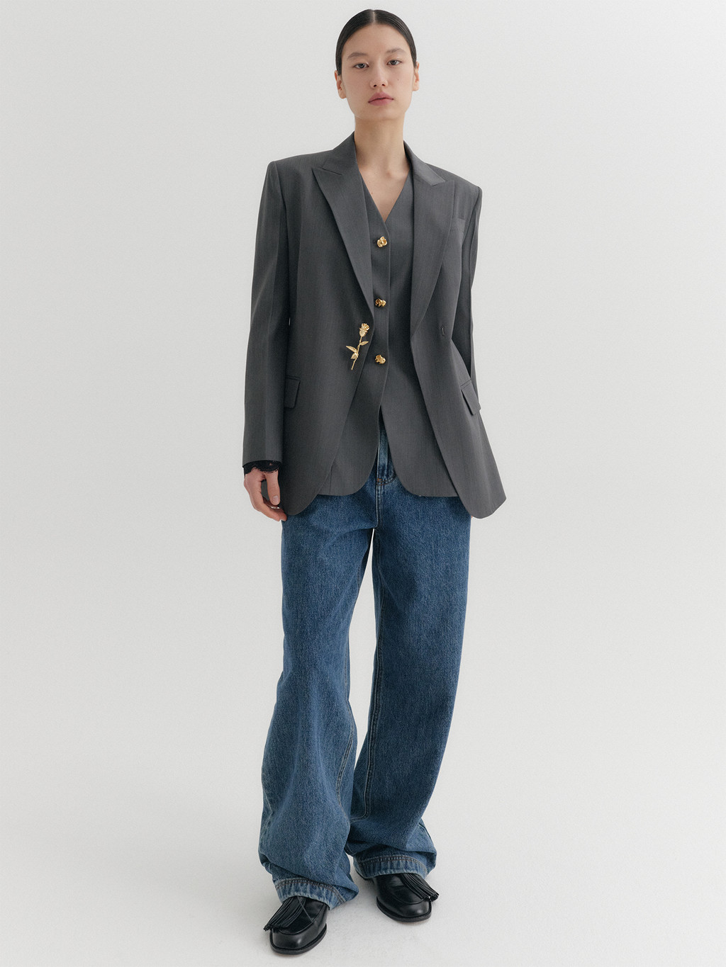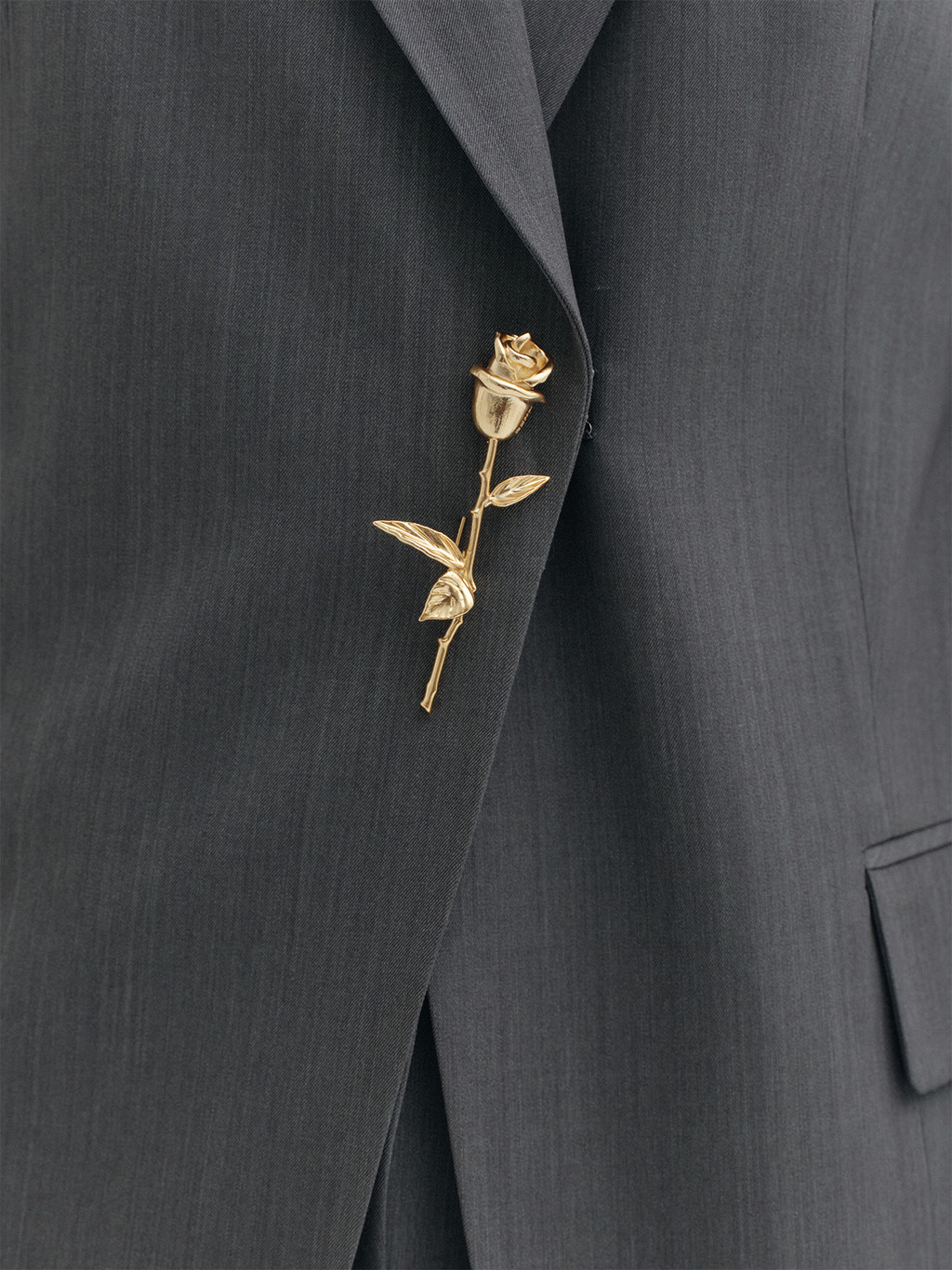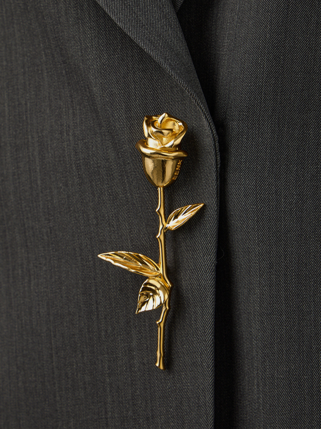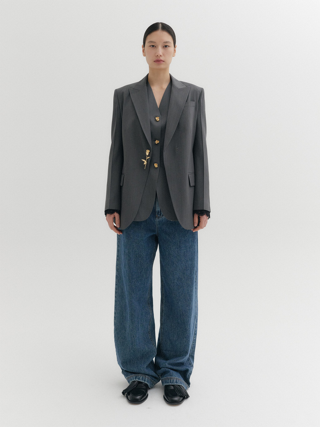 Lace Trim Blazer with Rose Brooch - GreyNEW