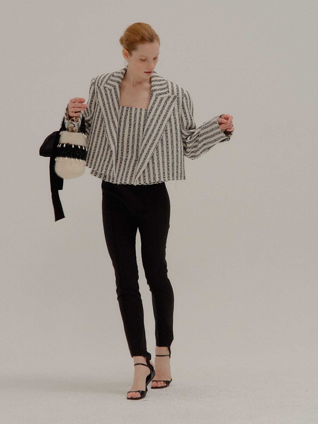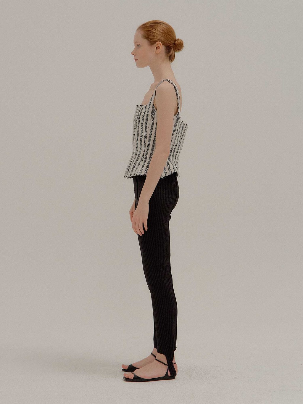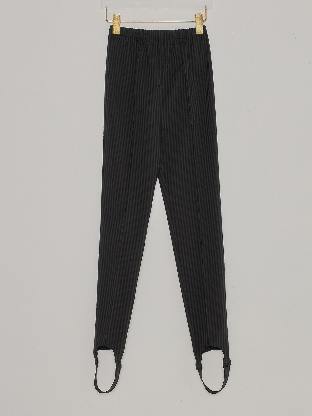 - Striped skinny pants with detachable footstraps.