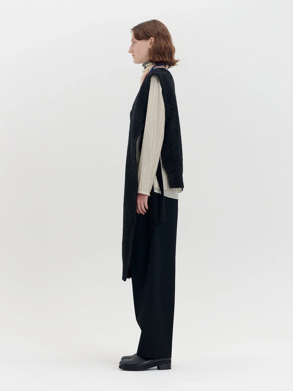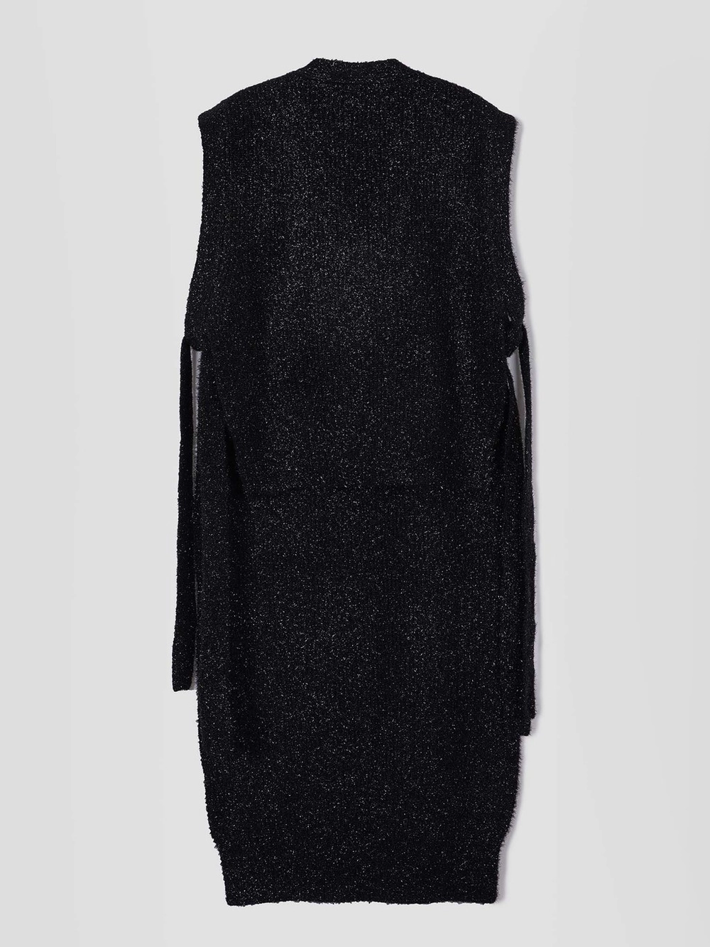 - Metallic v-neck unbalanced long vest in an oversized fit.