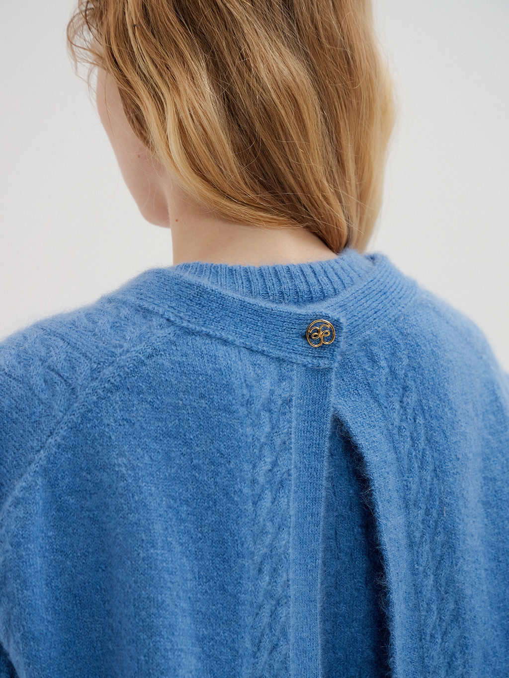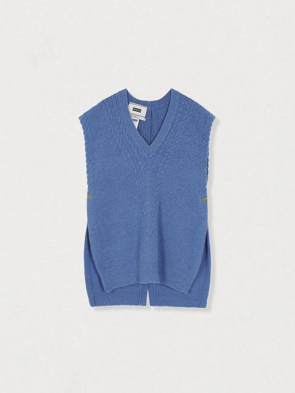 - Lavender transformable cable knit vest with gold EENK's logo buttons.