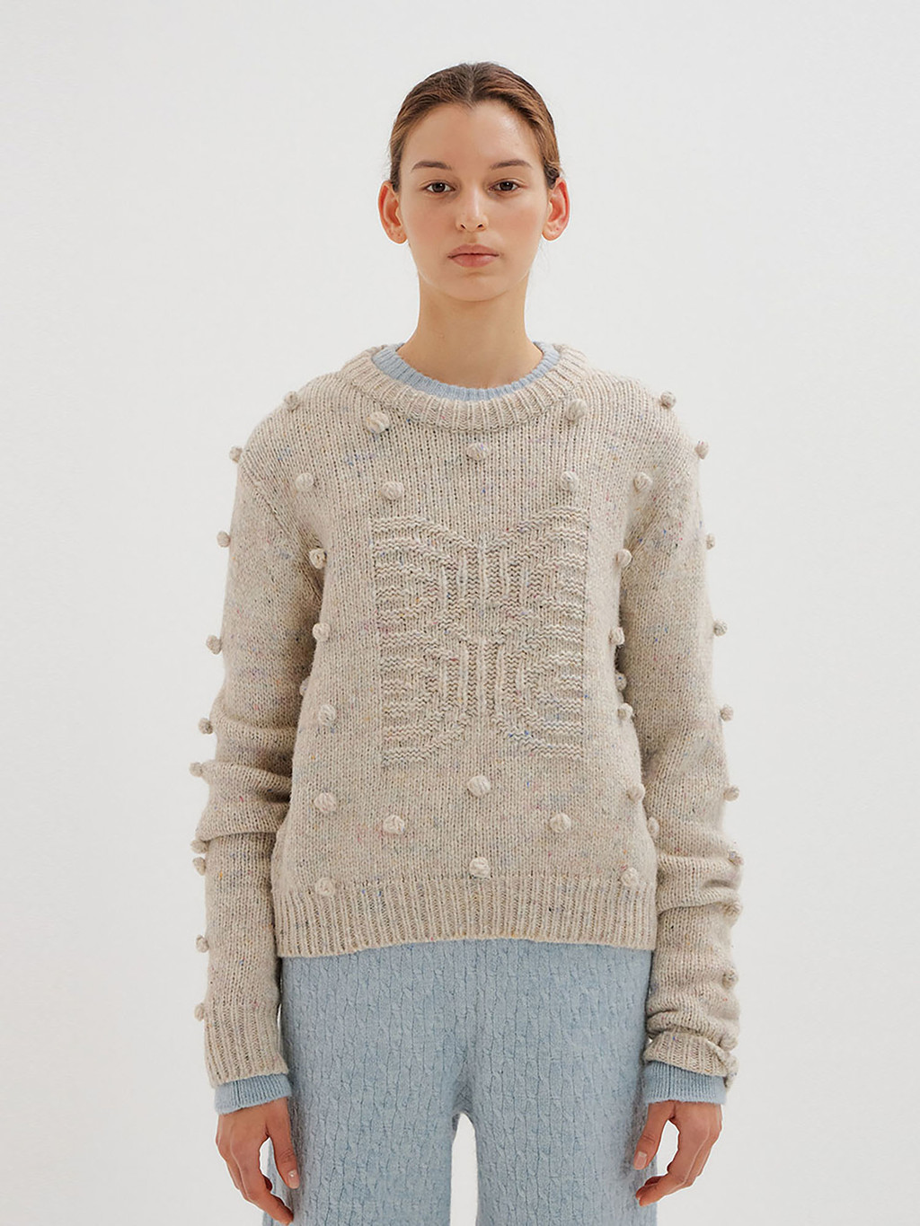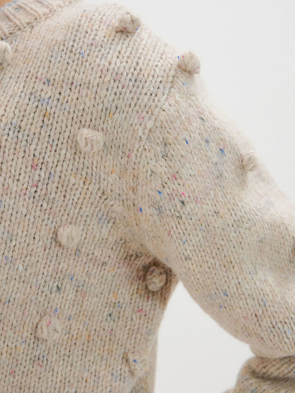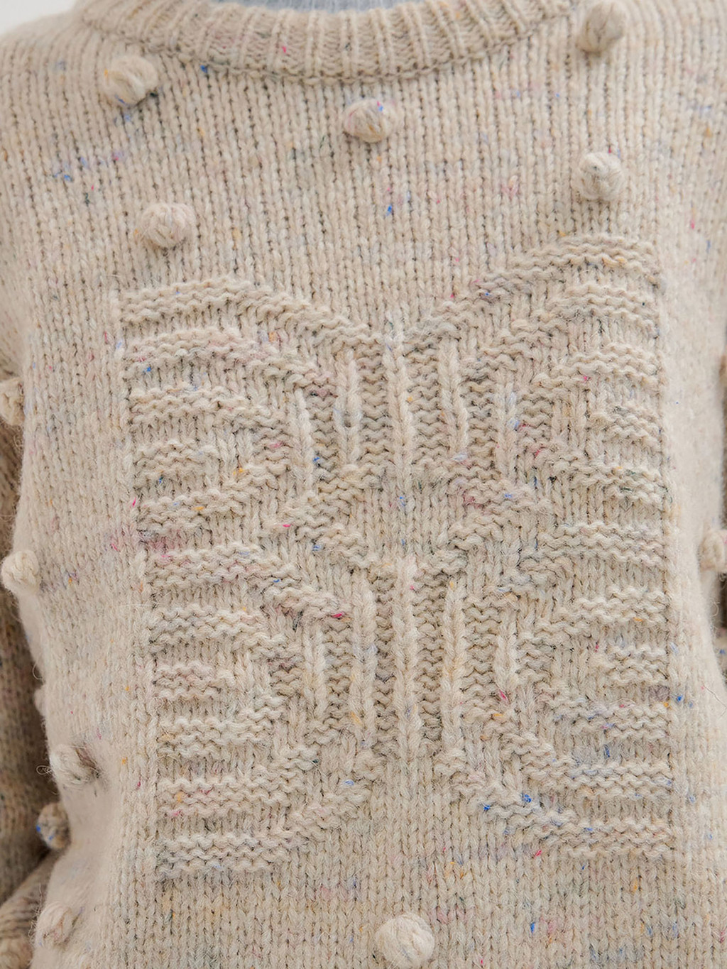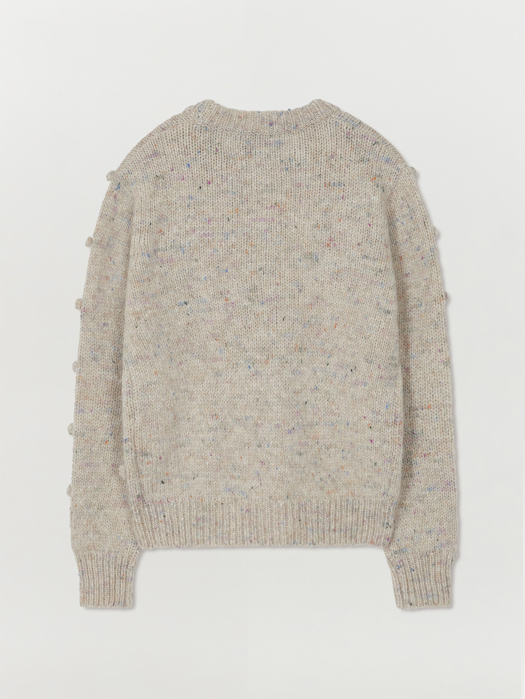 - Light grey pompom knit pullover interspersed with colored yarn.