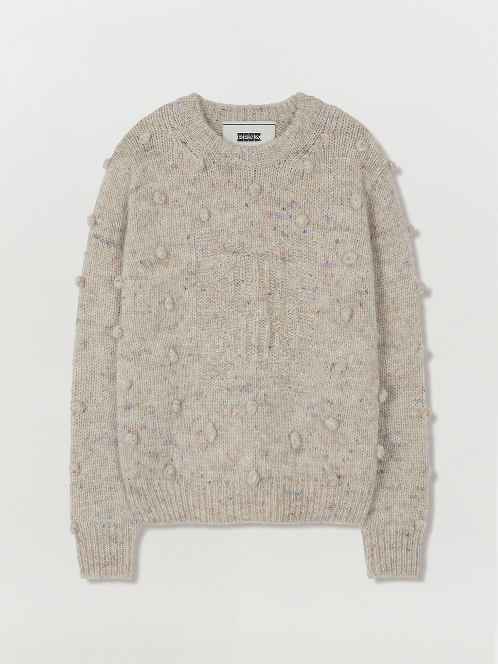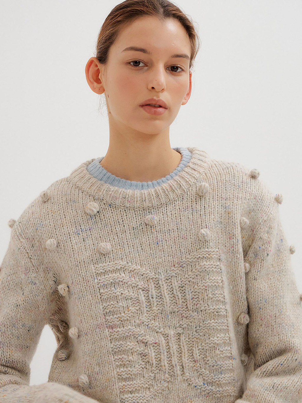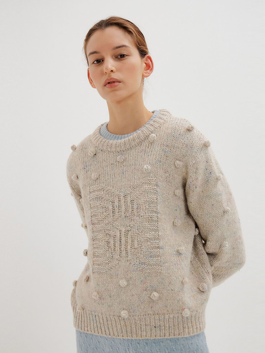 - Light grey pompom knit pullover interspersed with colored yarn.