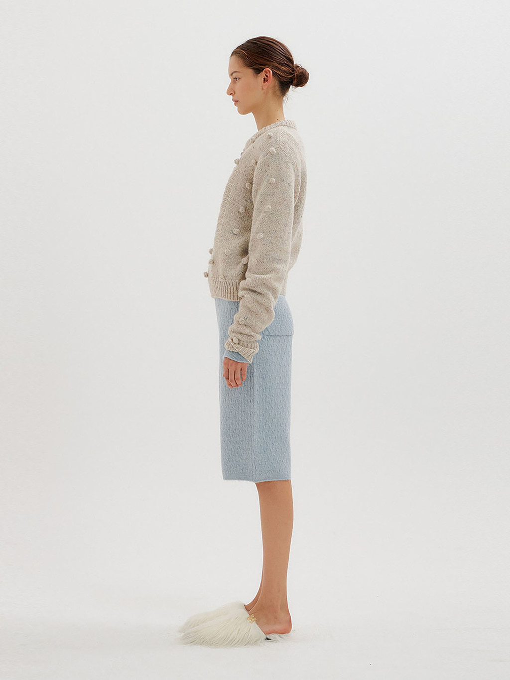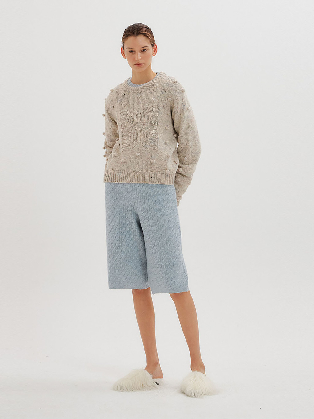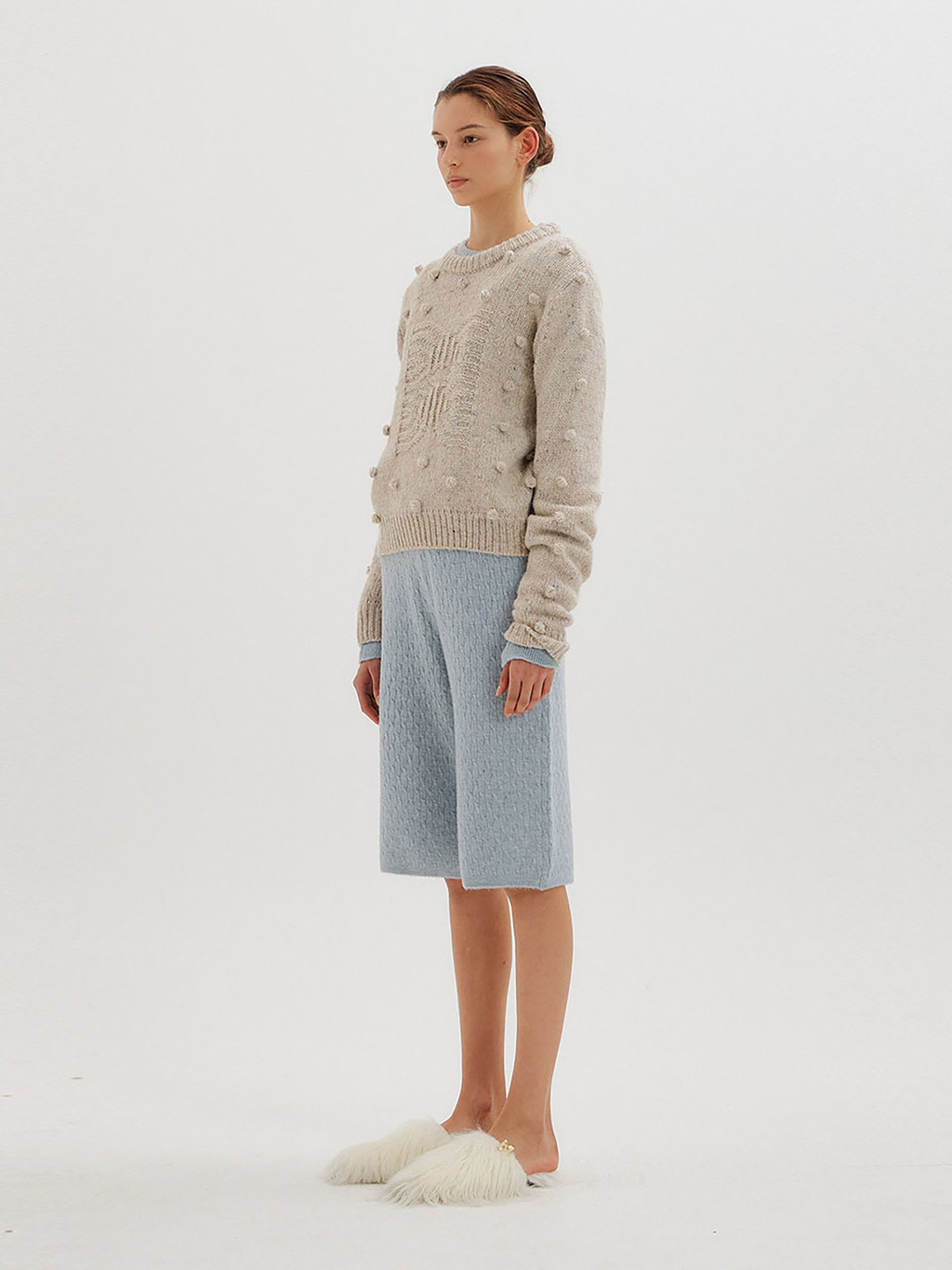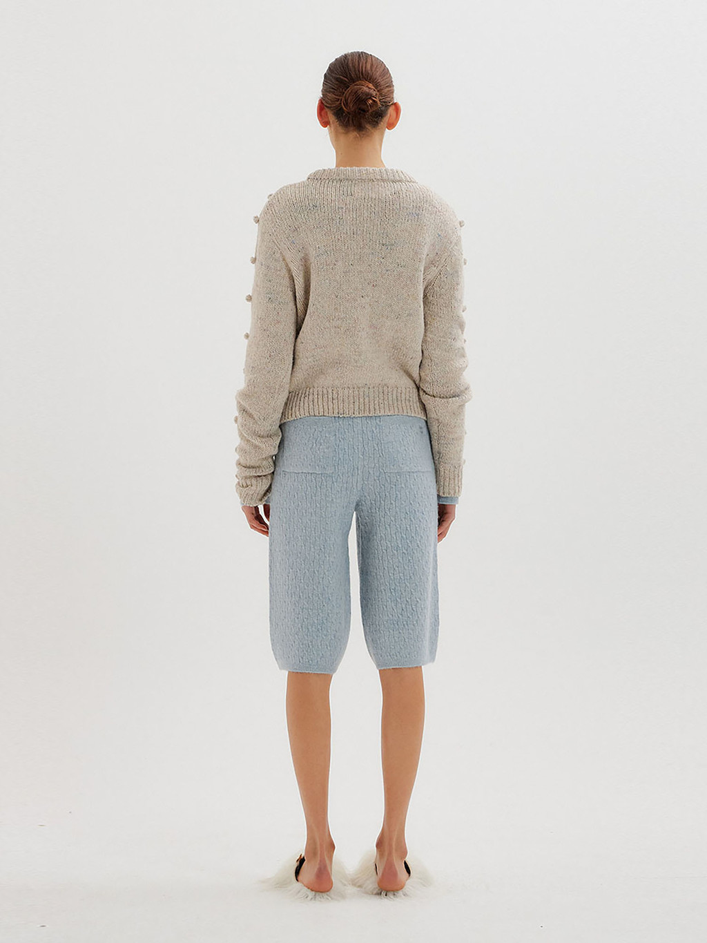 - Light grey pompom knit pullover interspersed with colored yarn.