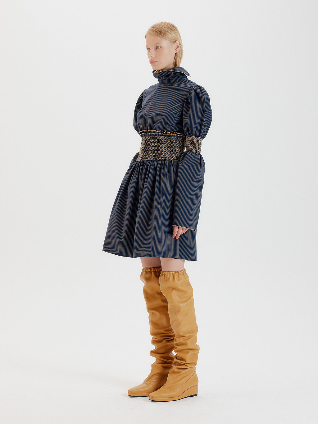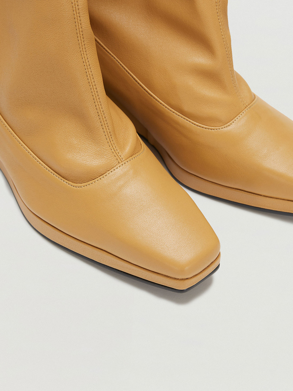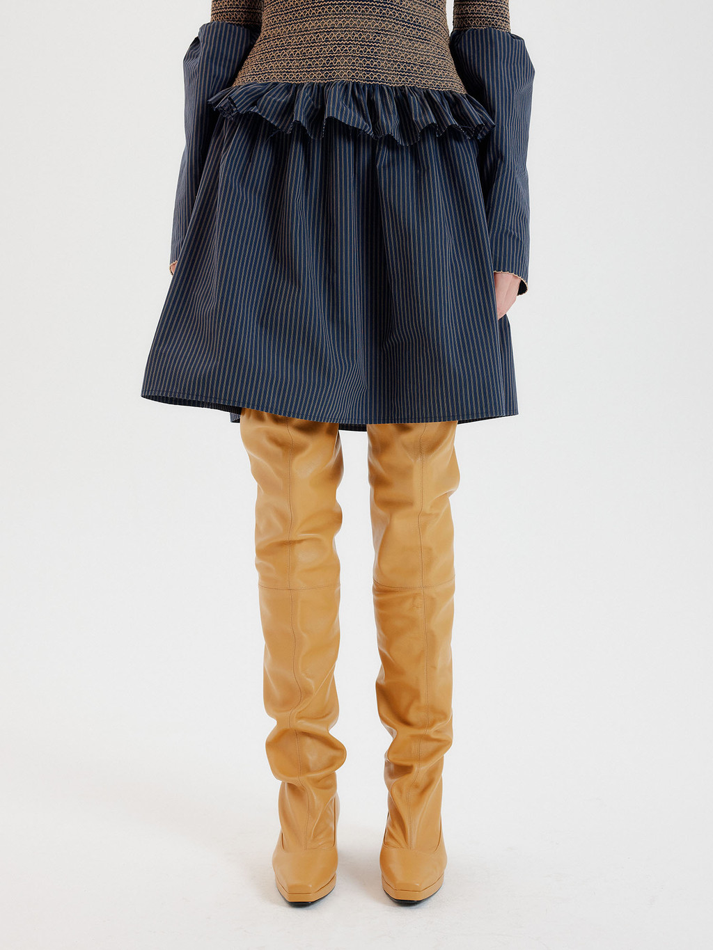 - Beige leather trimmed thigh high boots.