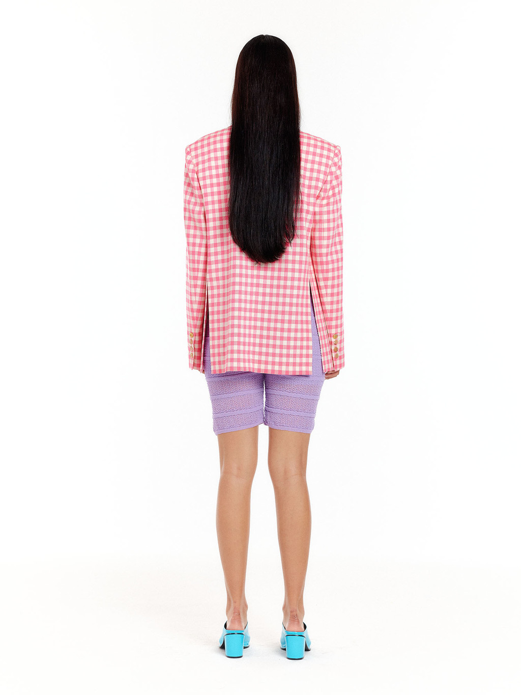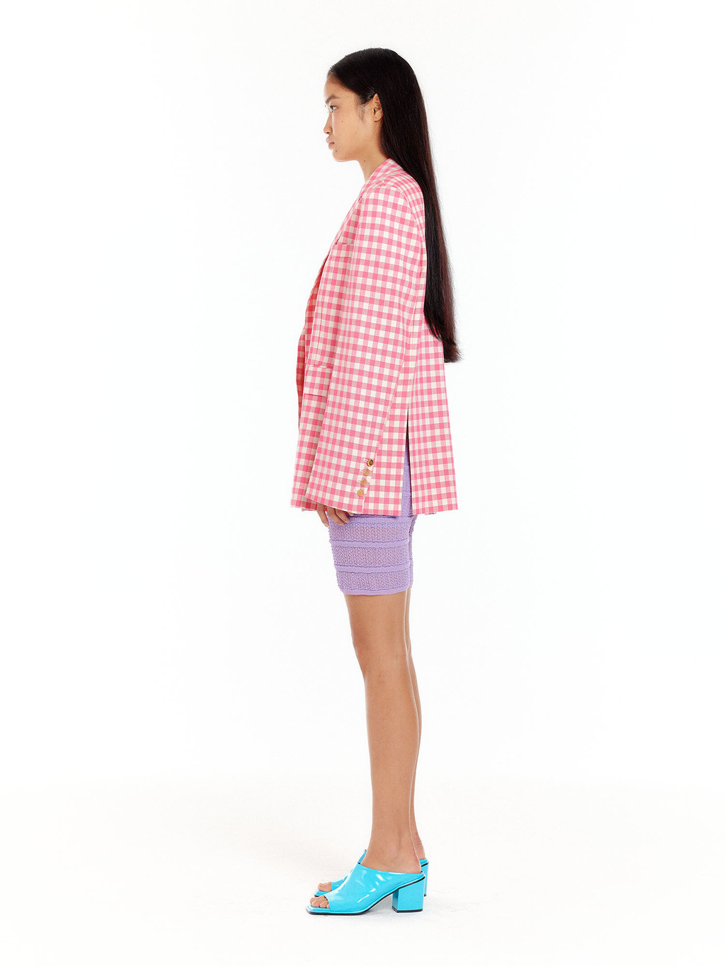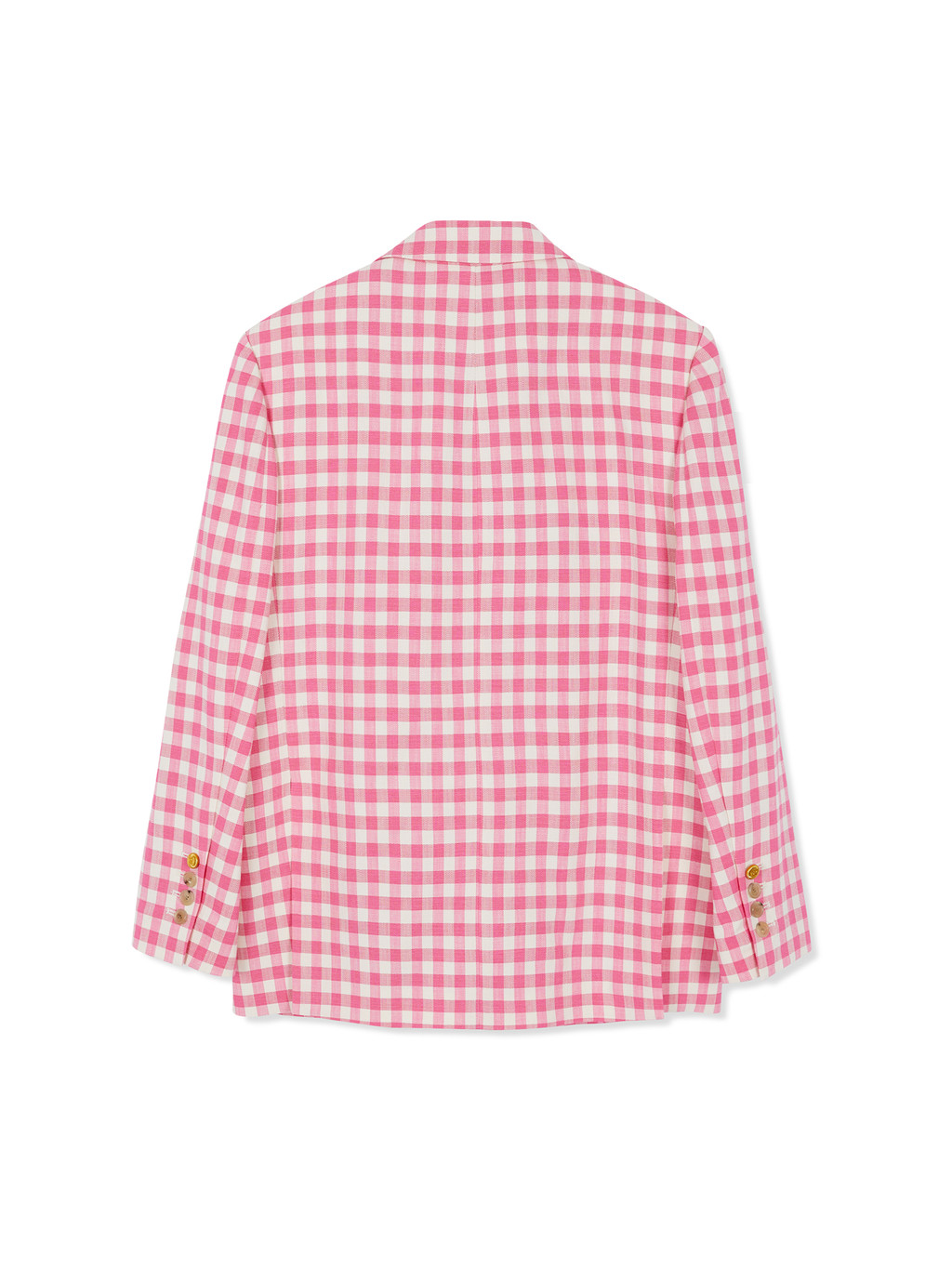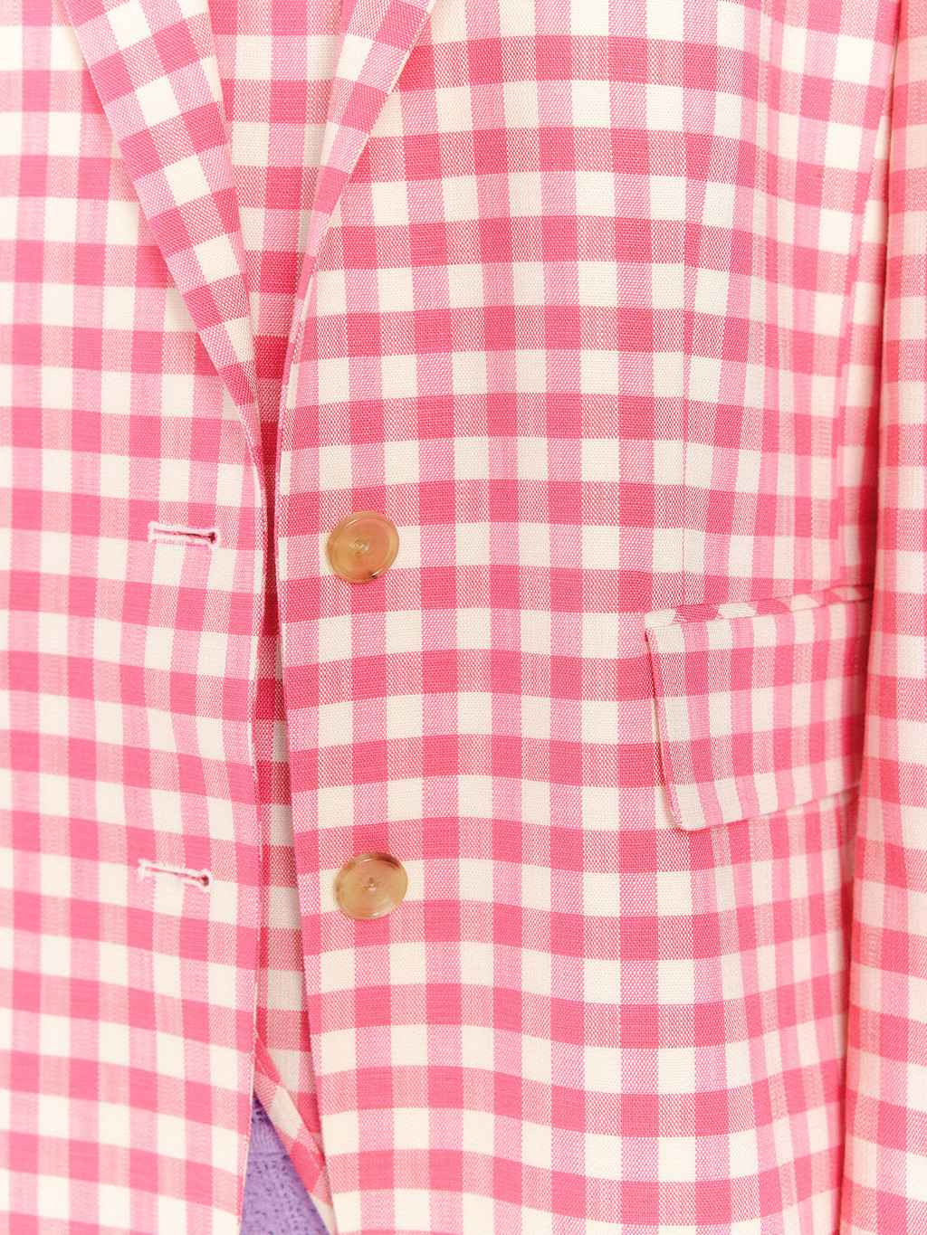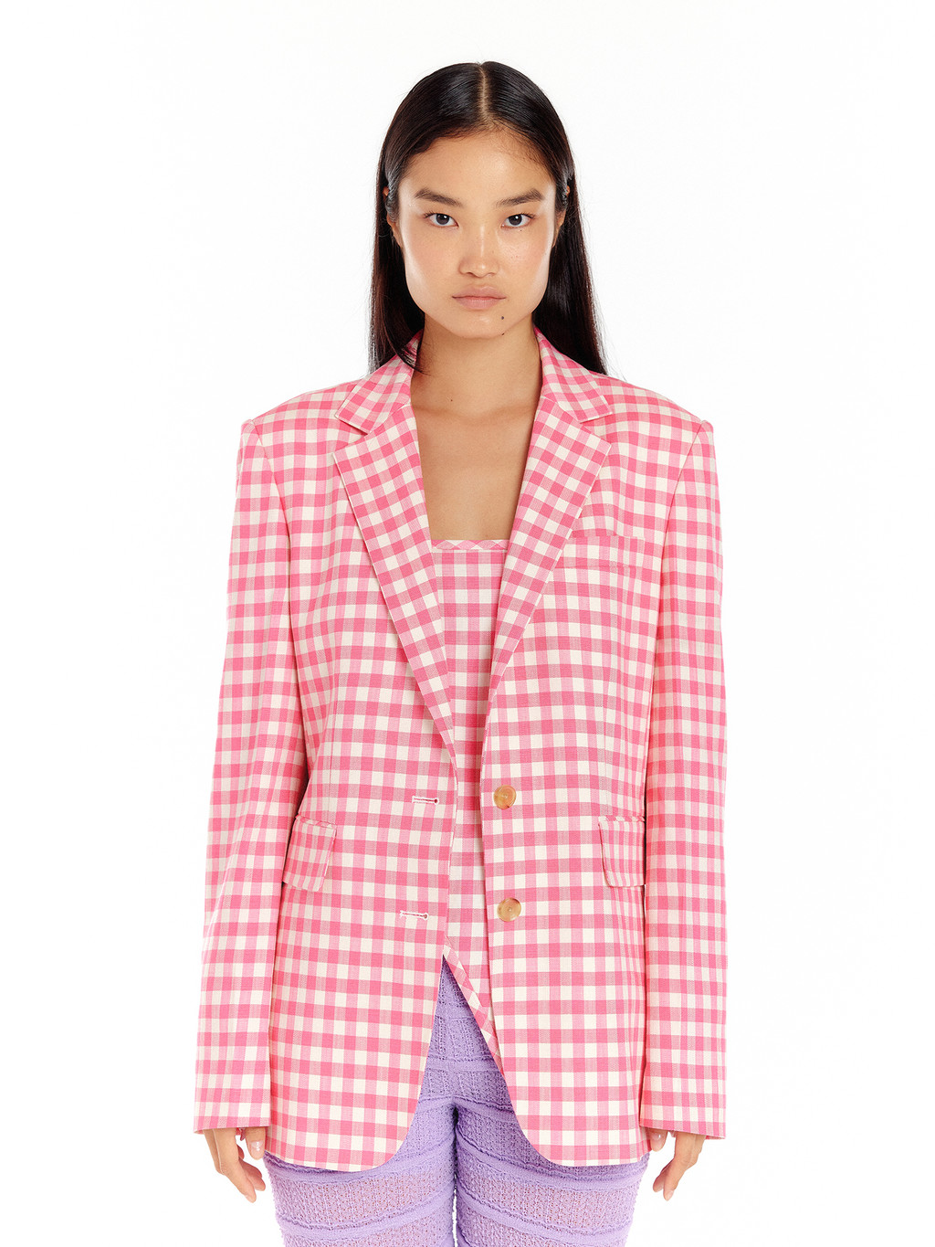 - Pink checkered single-breasted blazer in a classic silhouette.