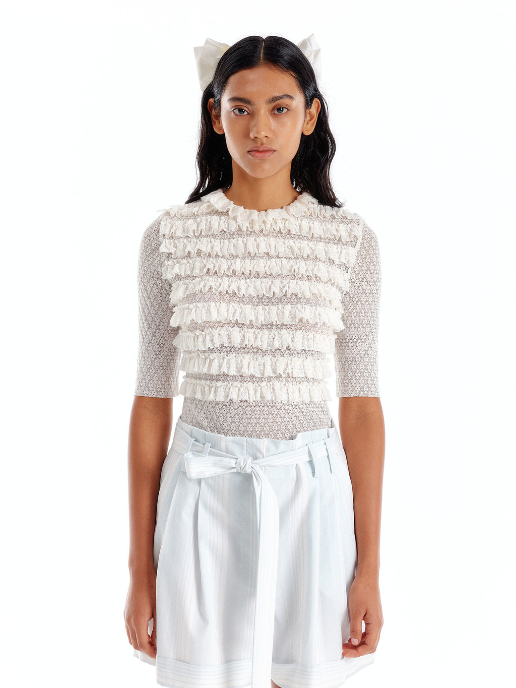 - Ruffle short sleeve jersey top in white.