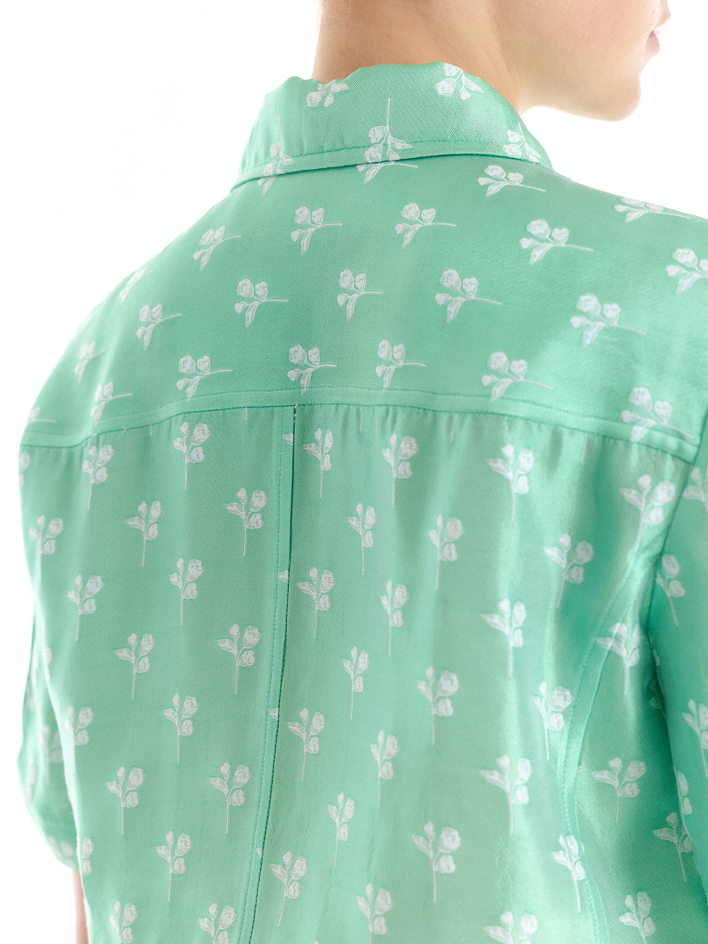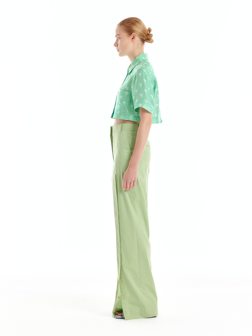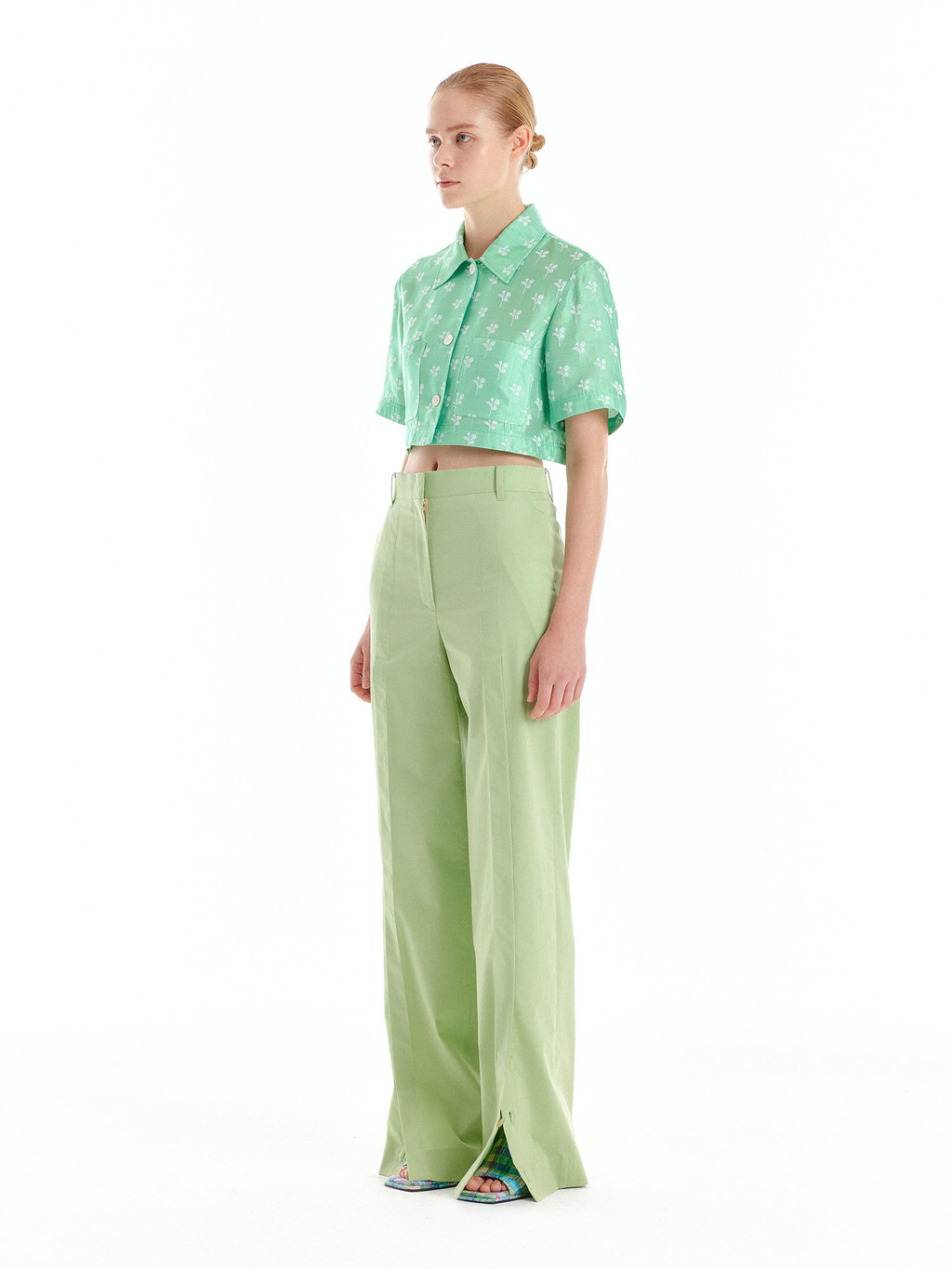 - Floral cropped shirt in light green with front pockets.