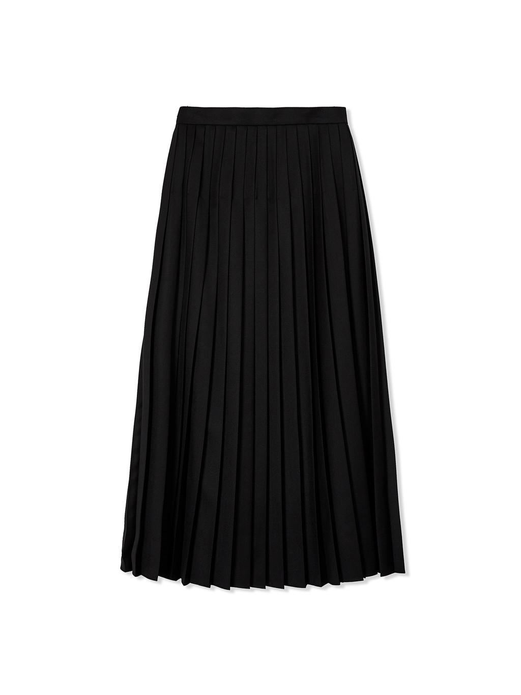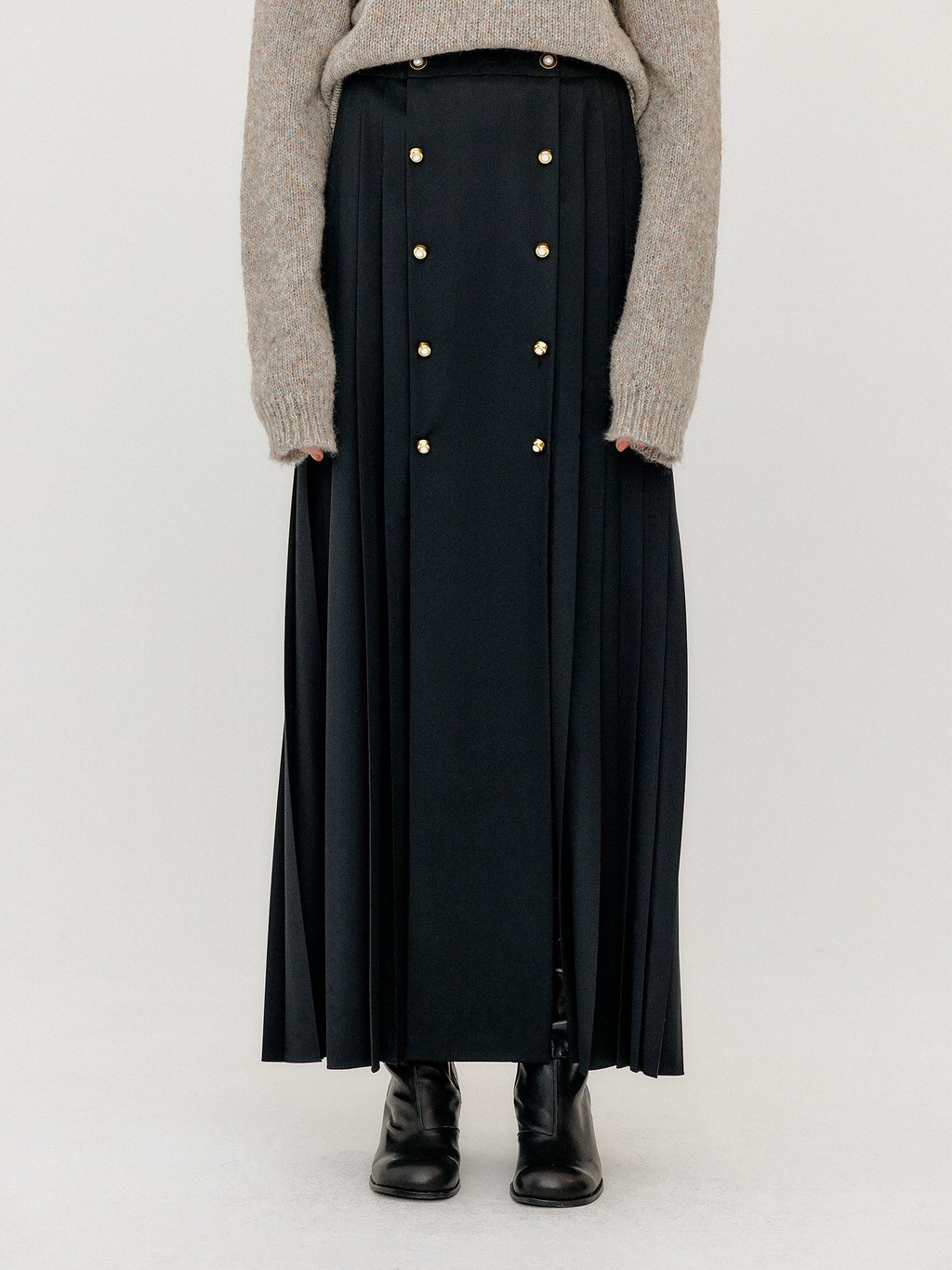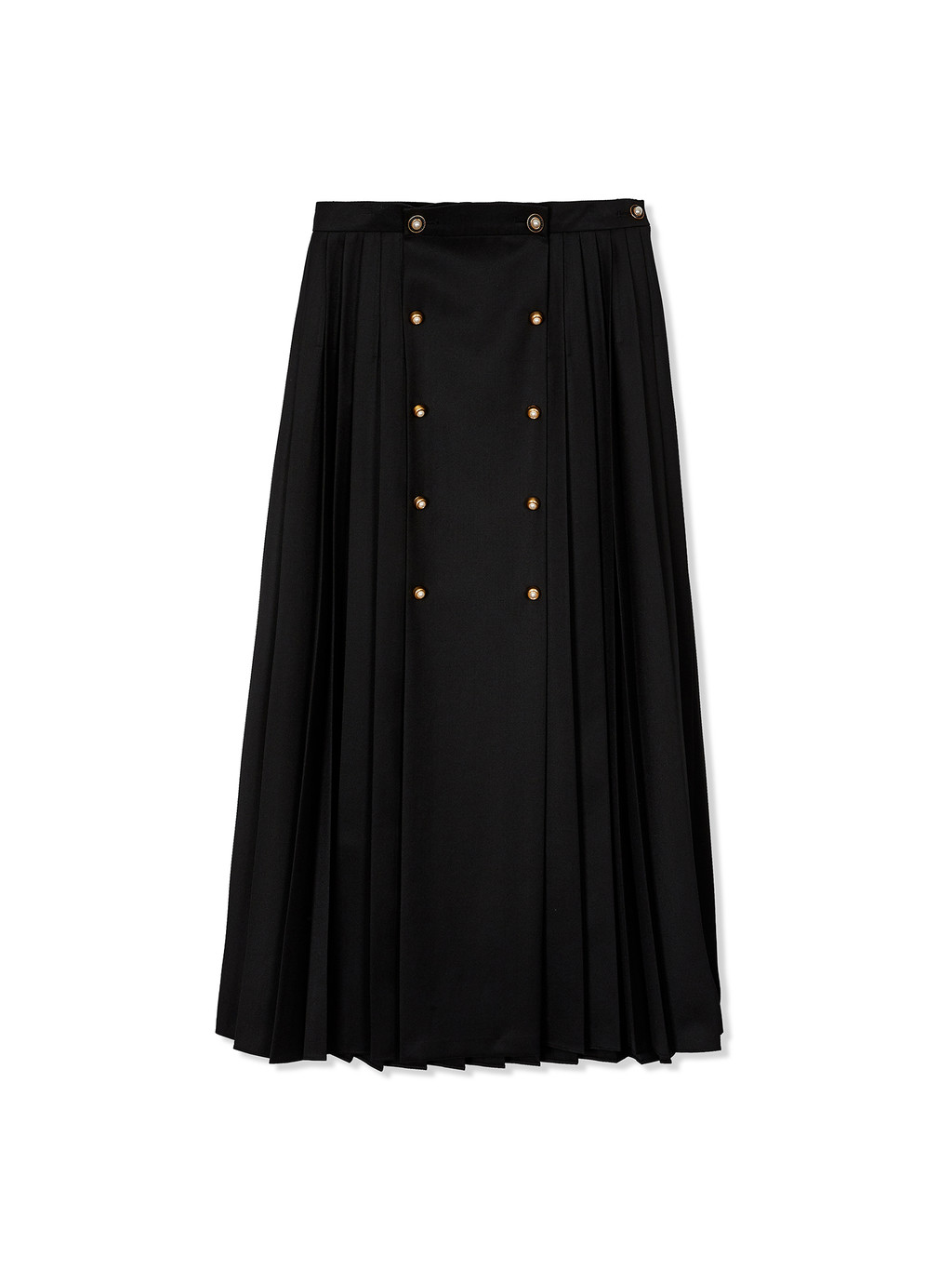 - Button front pleated skirt in black.