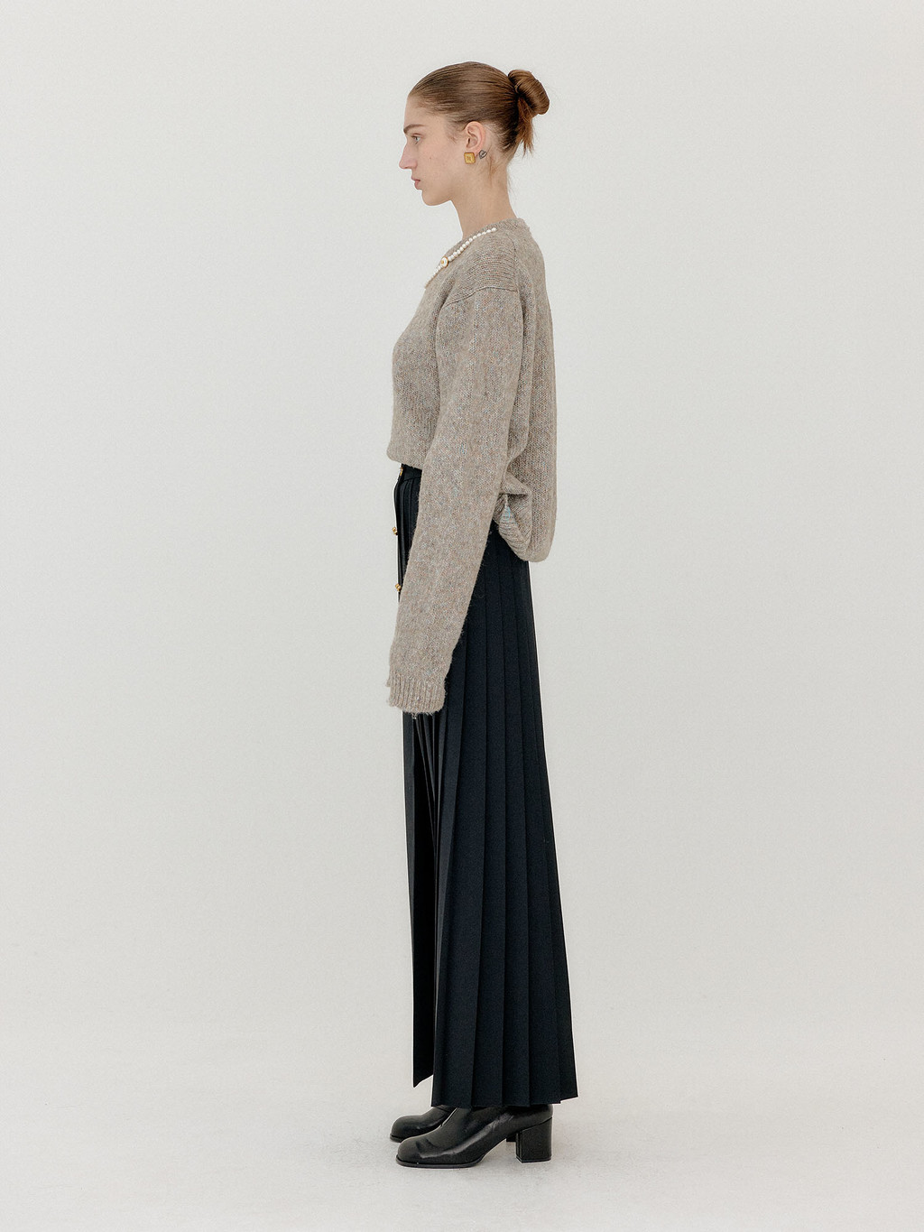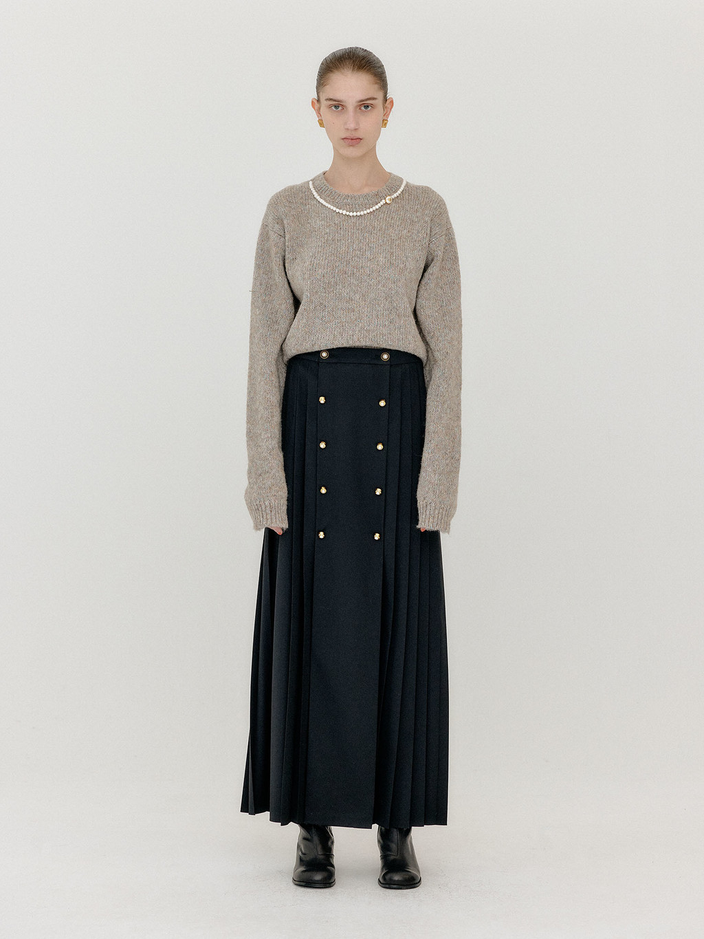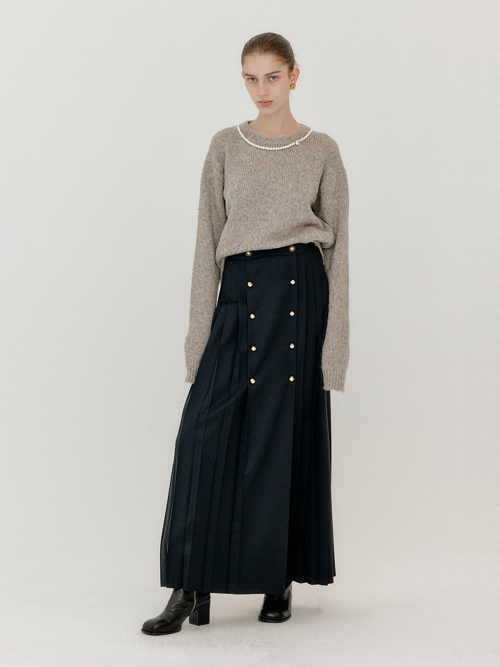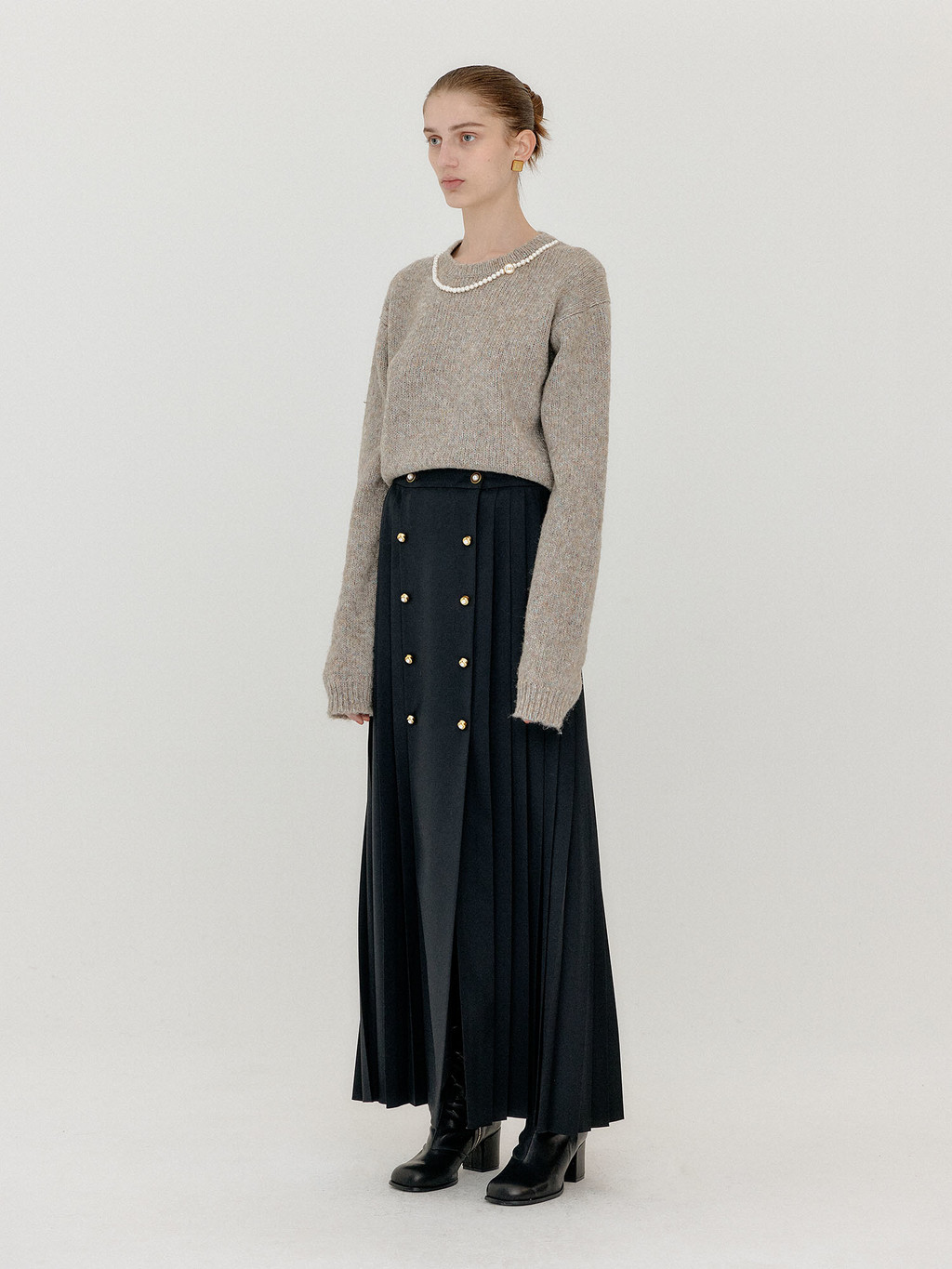 - Button front pleated skirt in black.