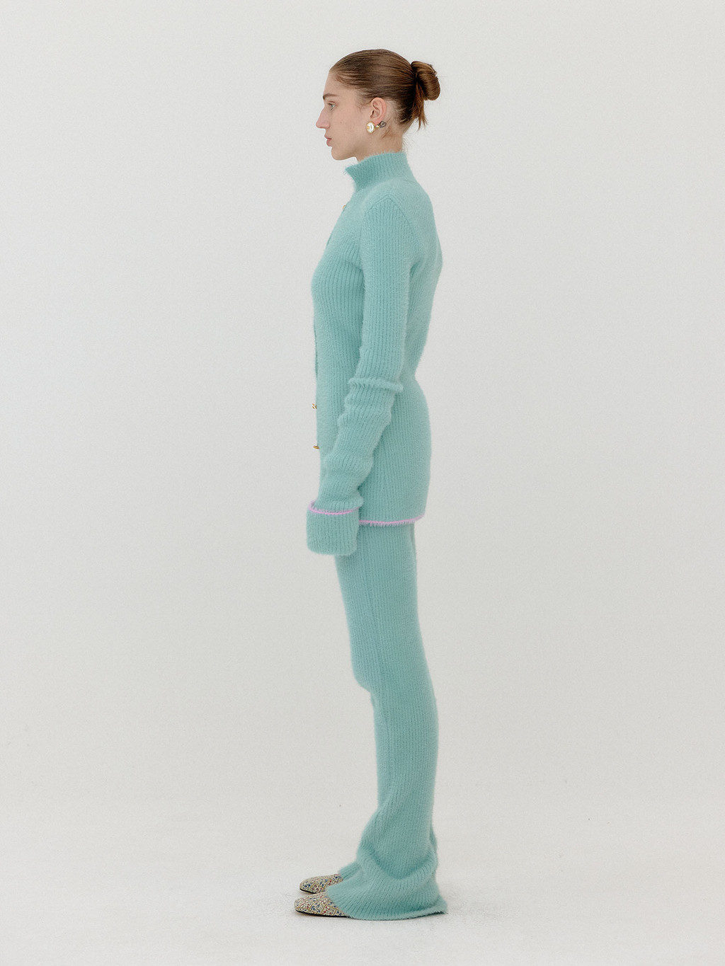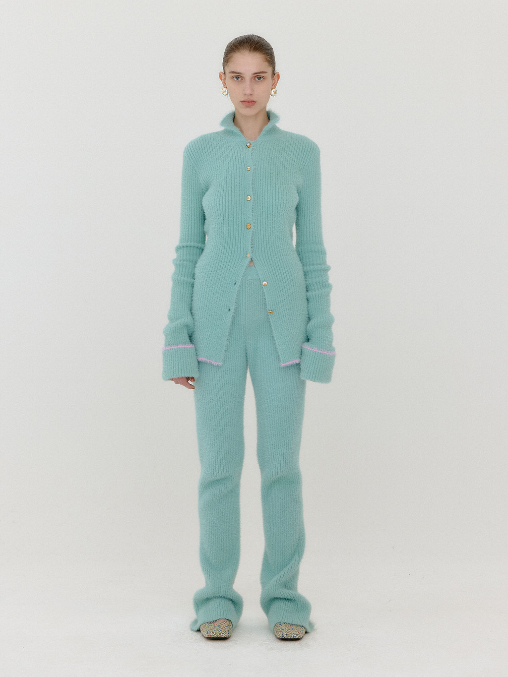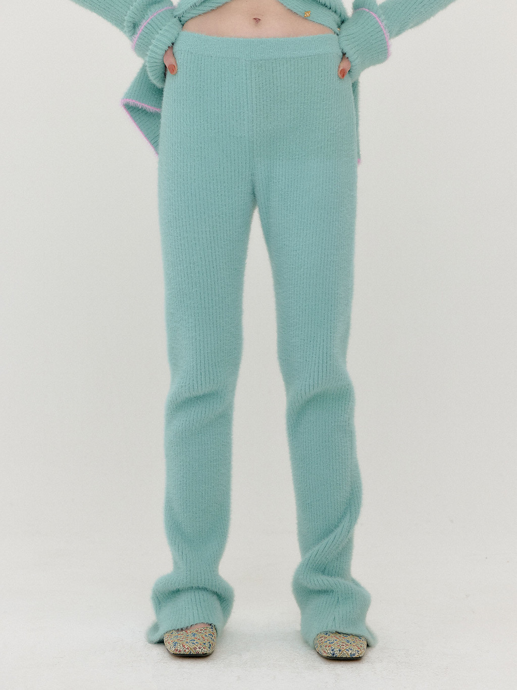- Ribbed knit pants in mint.