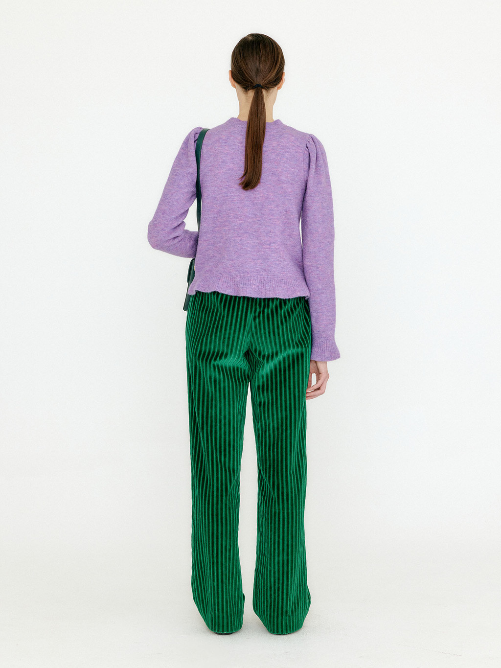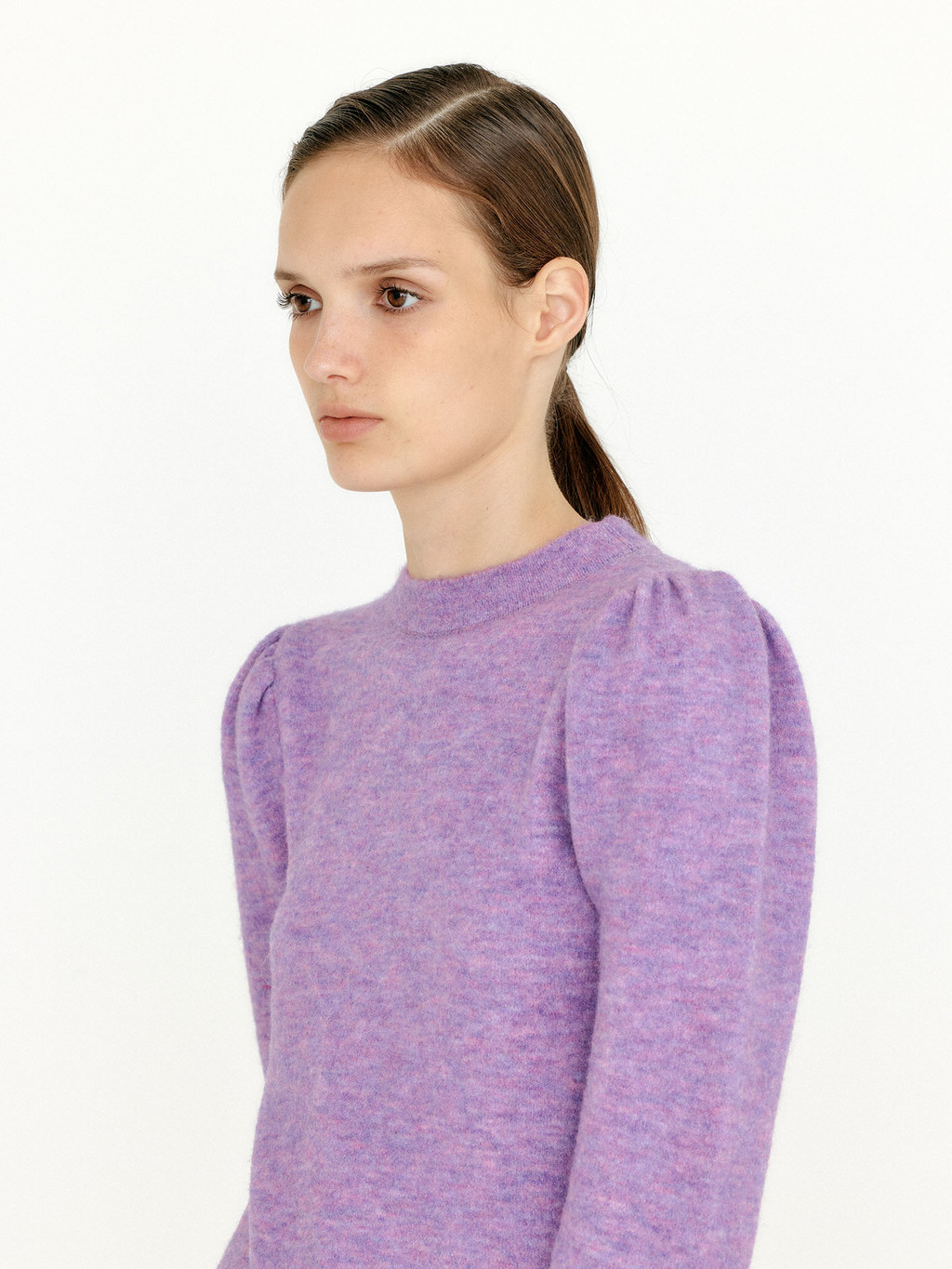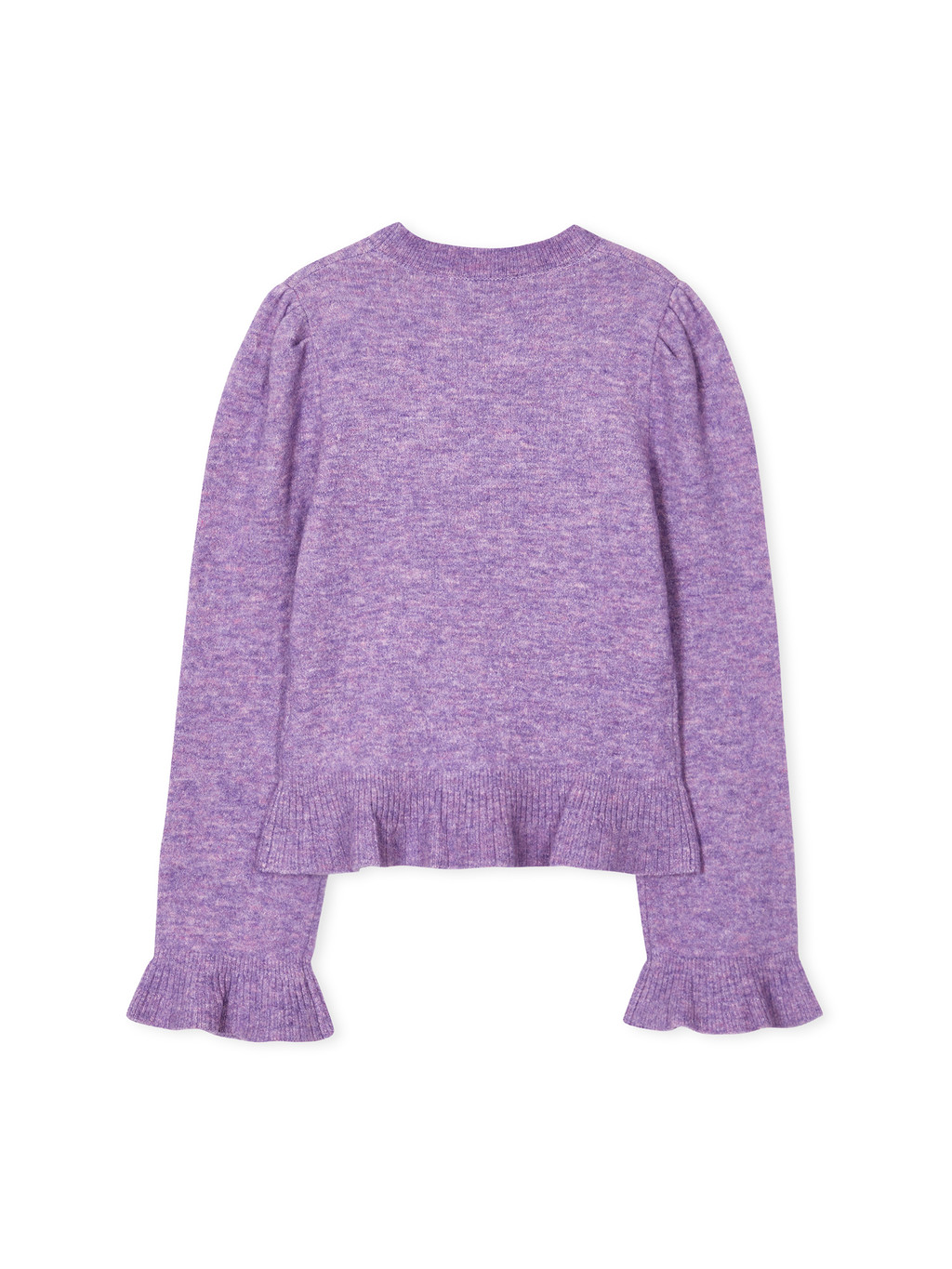 - Flared hem knit pullover in violet.