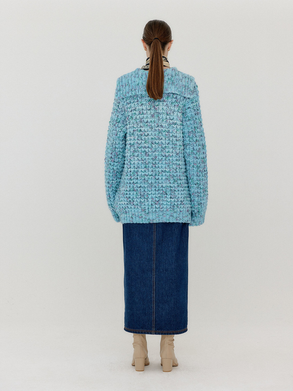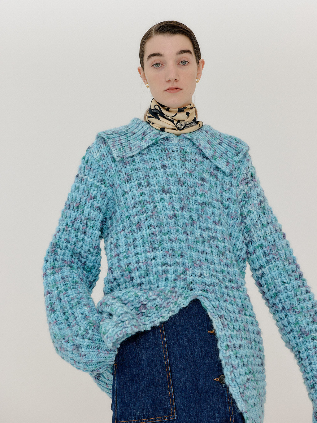 - Collared knit pullover in light blue.