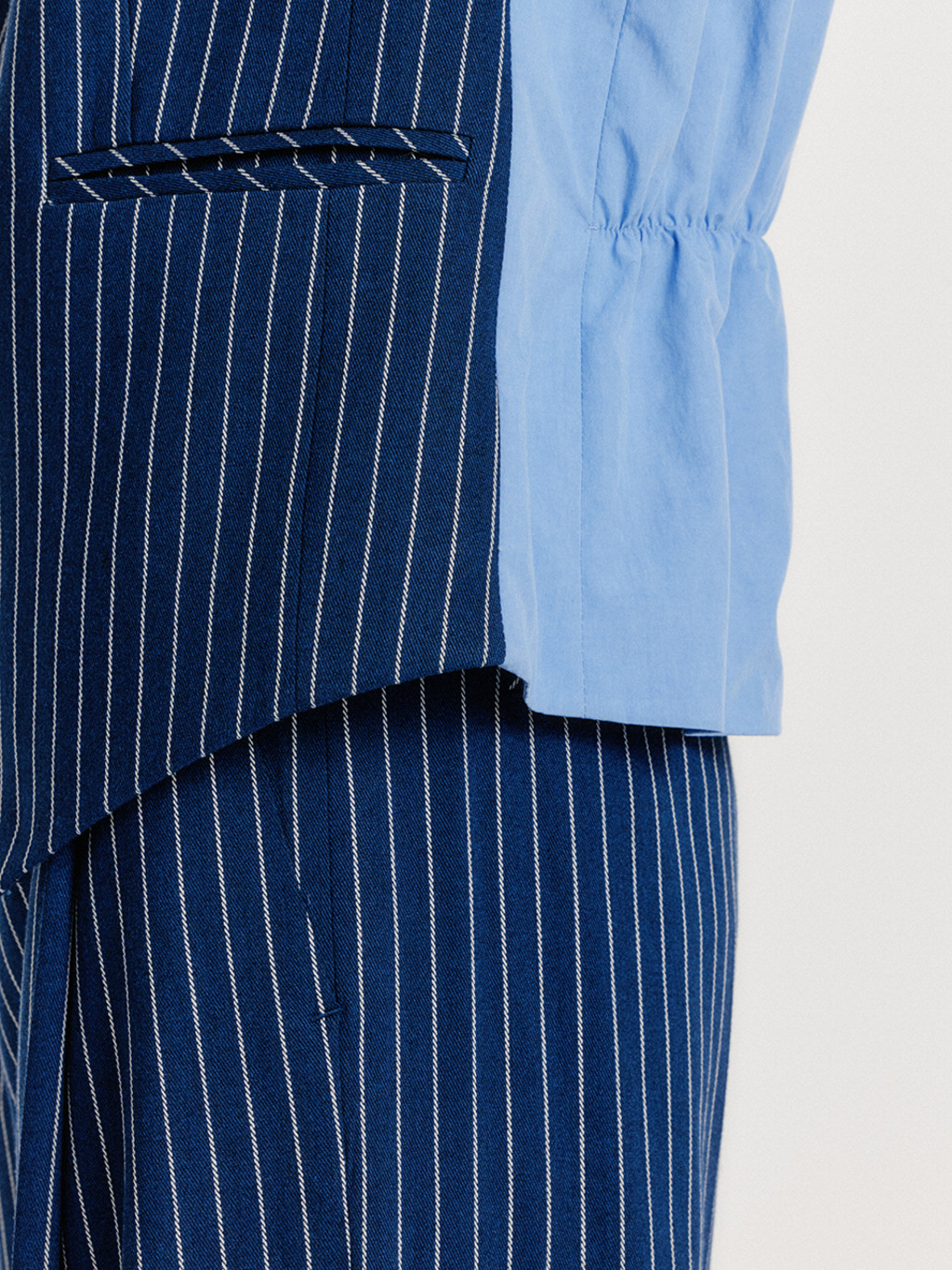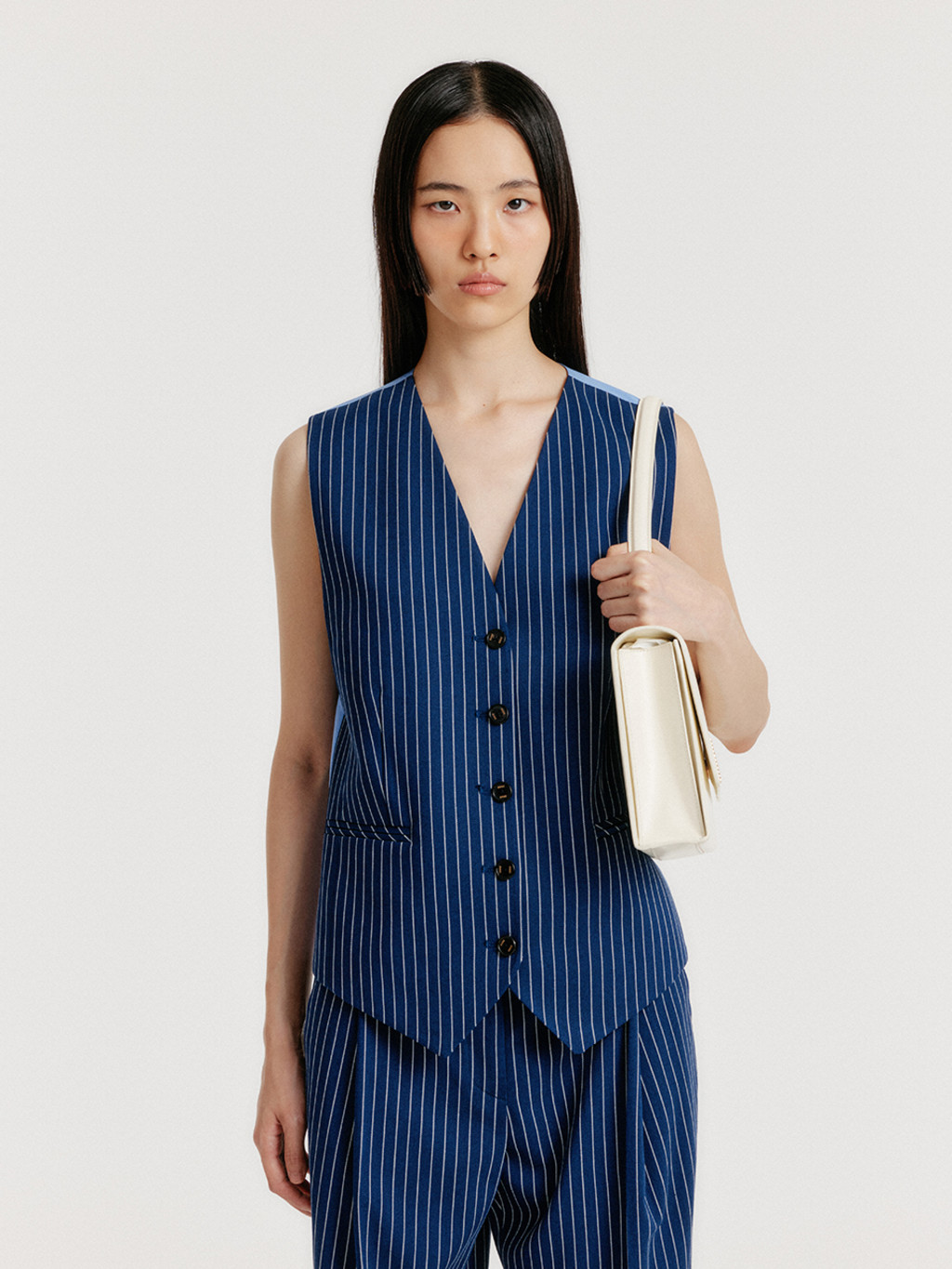 - One-button vest with a stripe pattern.