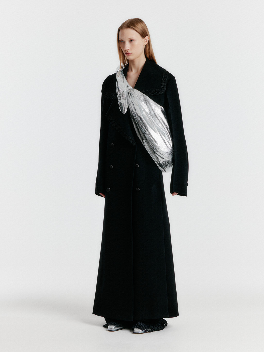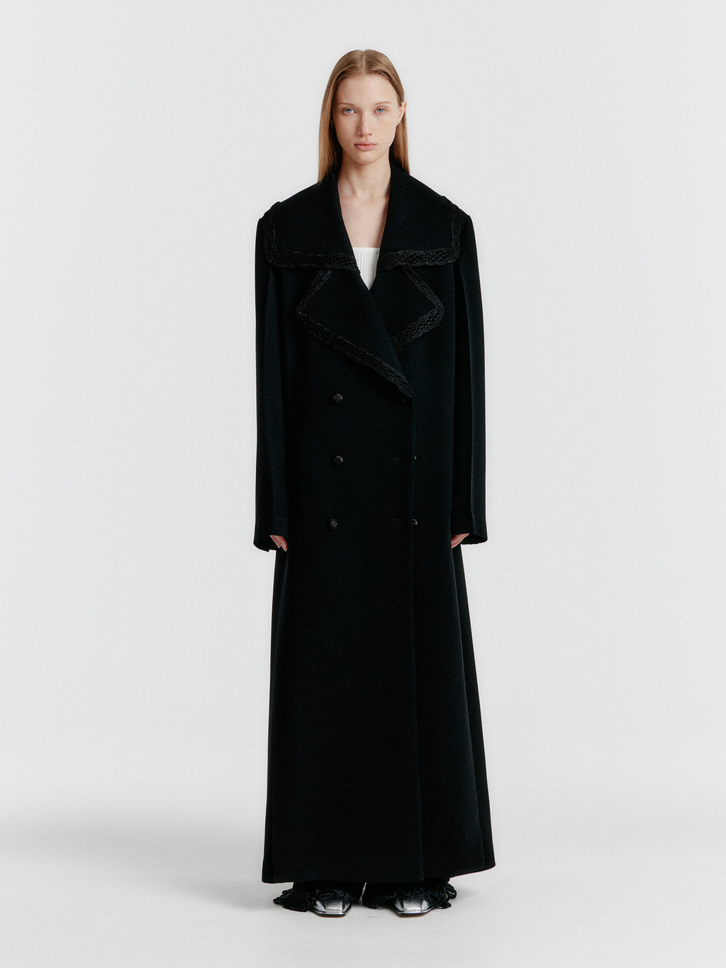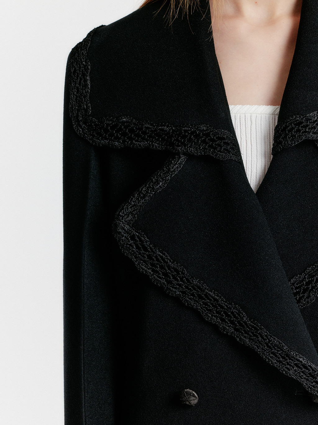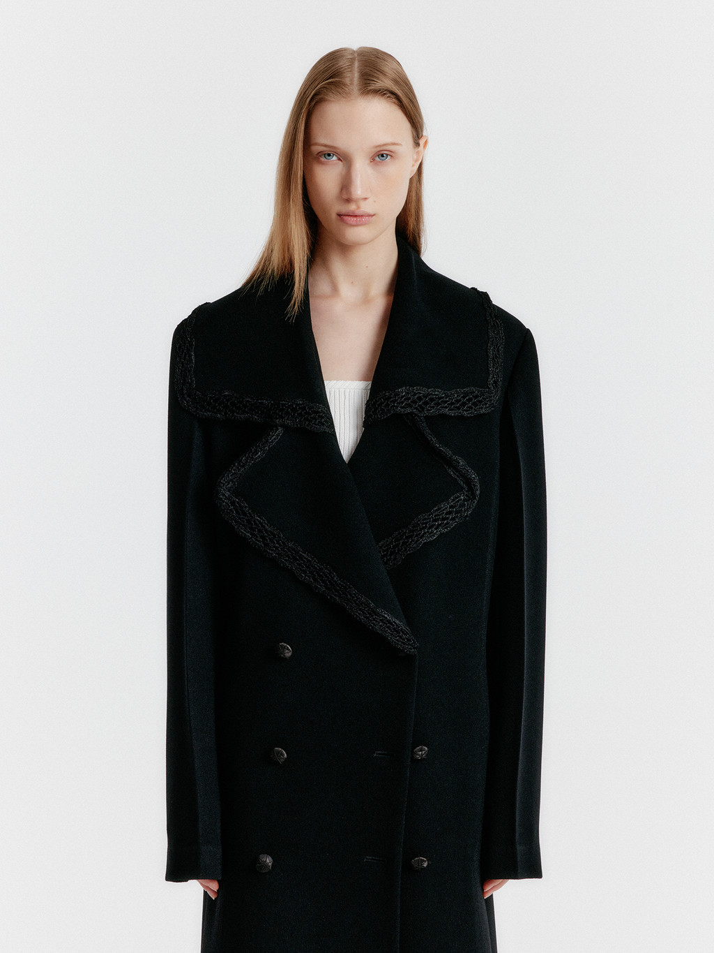 - Big collar coat with lace trimming detail.