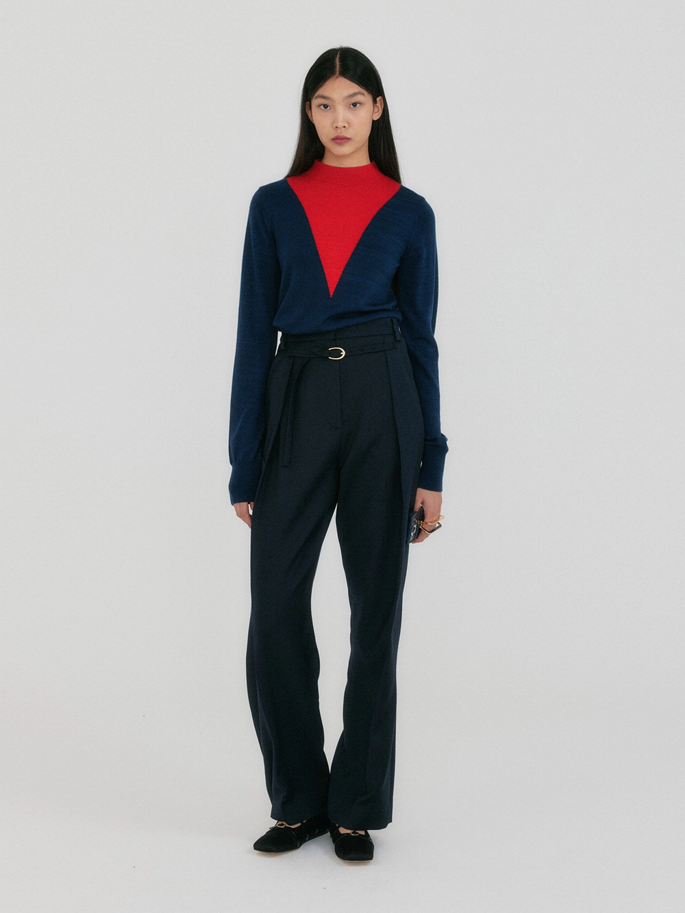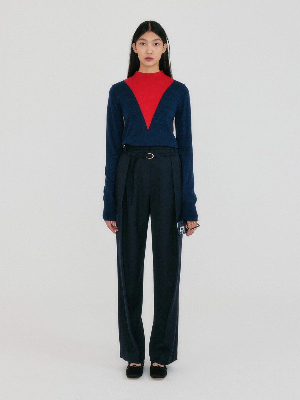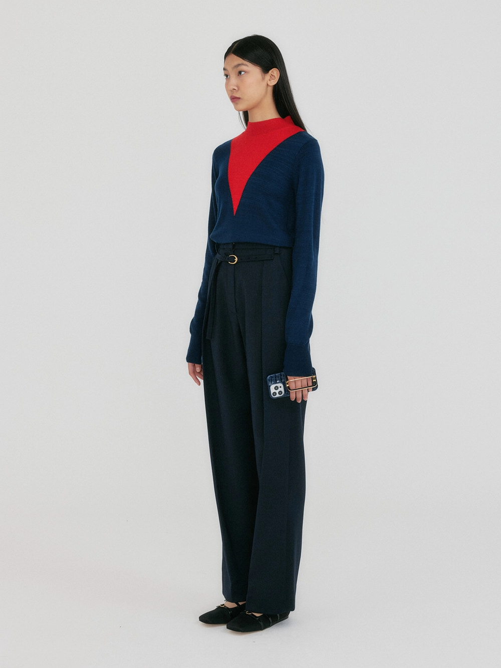 ZOE V-Point Mockneck Knit Pullover - Navy/Red