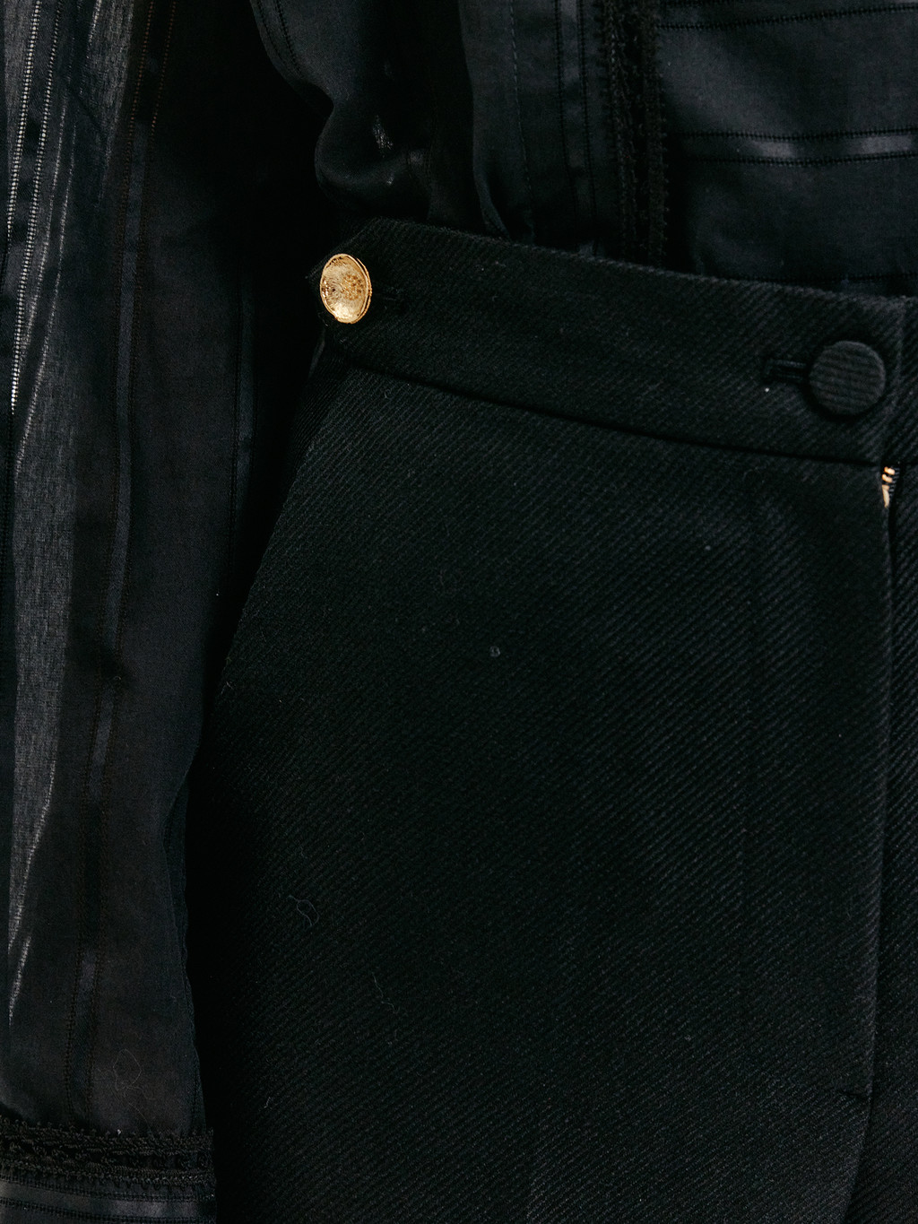 - Side gold decorative button at the waist