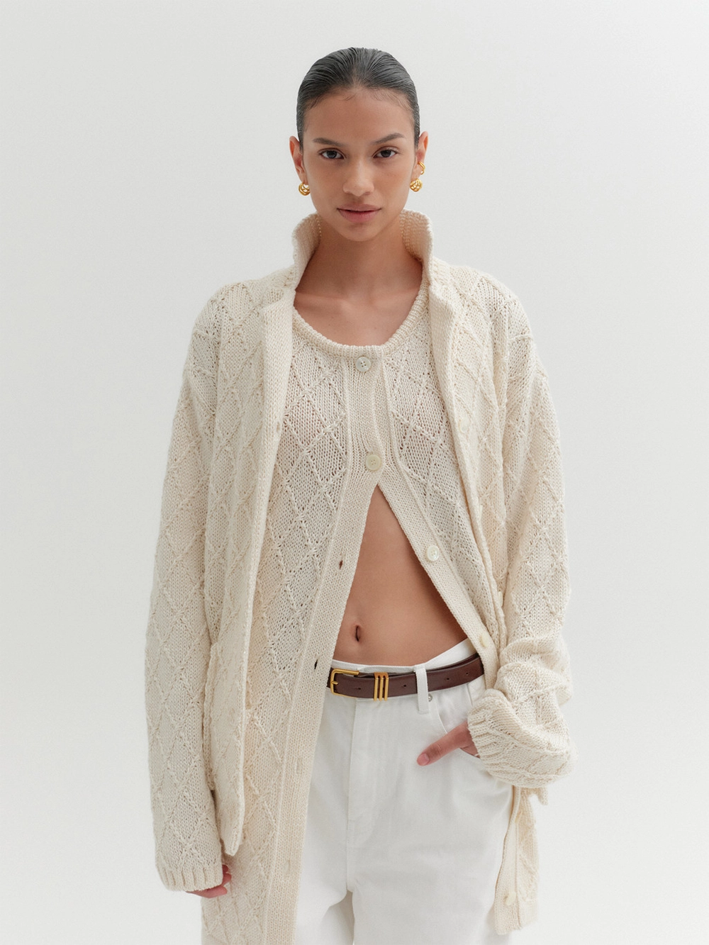 * The product worn by the model is a sample made in size S for the photoshoot. However, there may be differences in total length and specific measurements compared to the actual product. Please refer to the detailed measurements provided on the product page for accurate sizing.