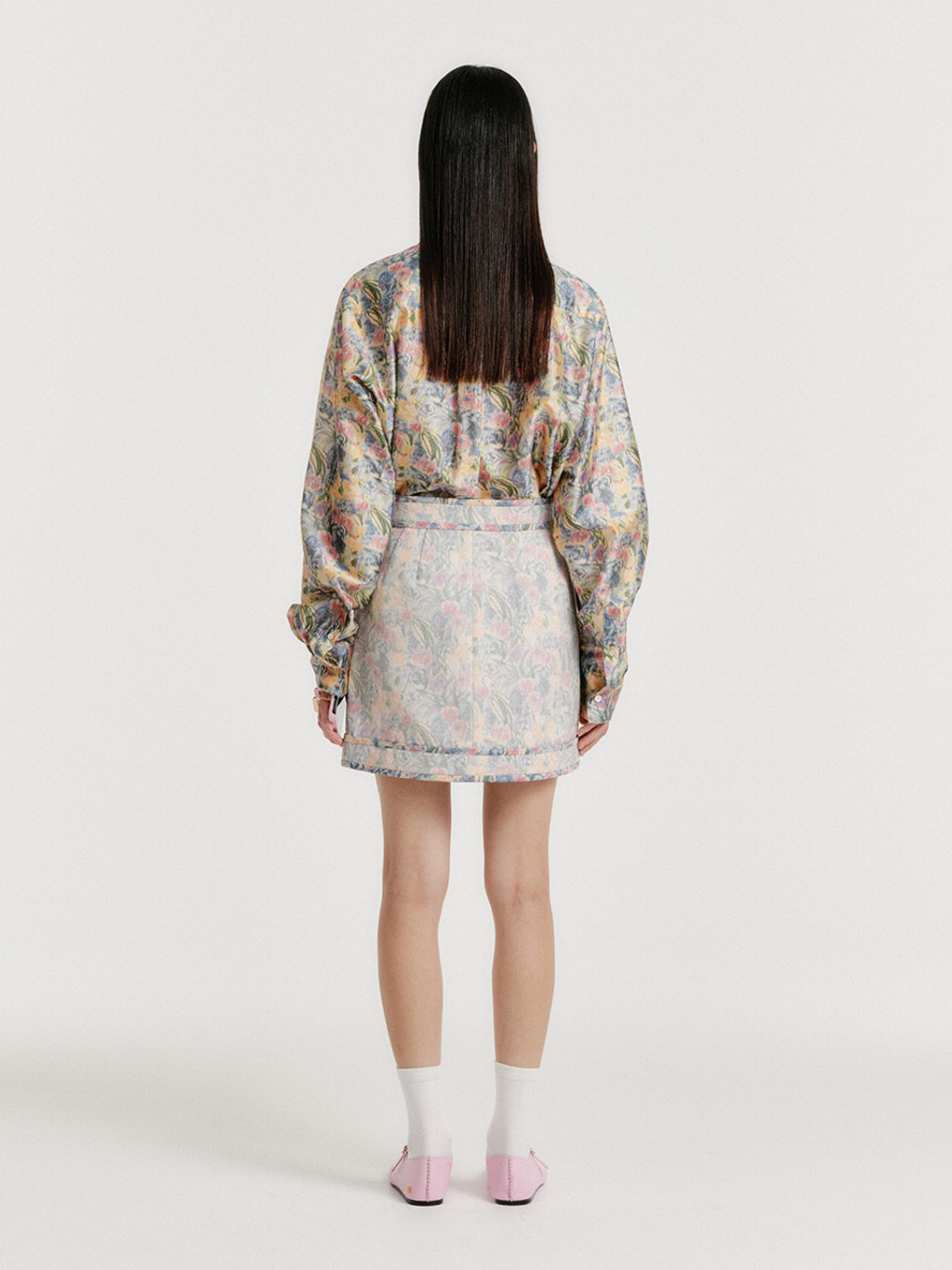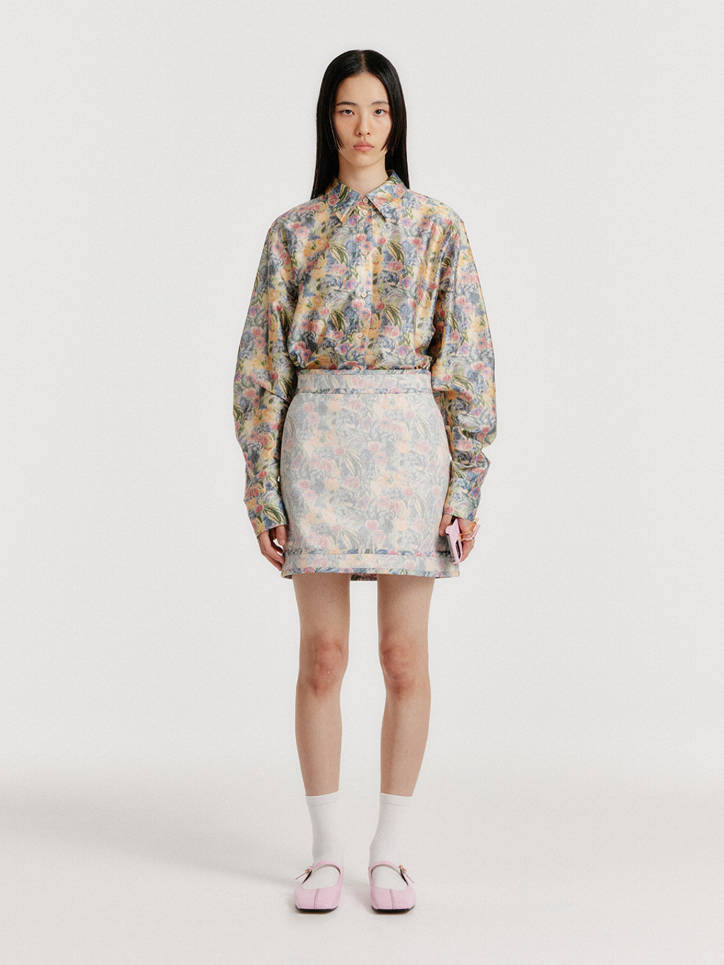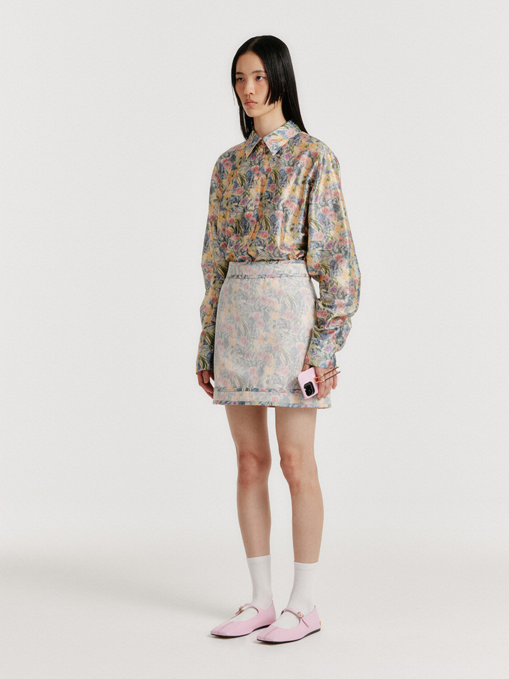 - Floral-patterned silk shirt.