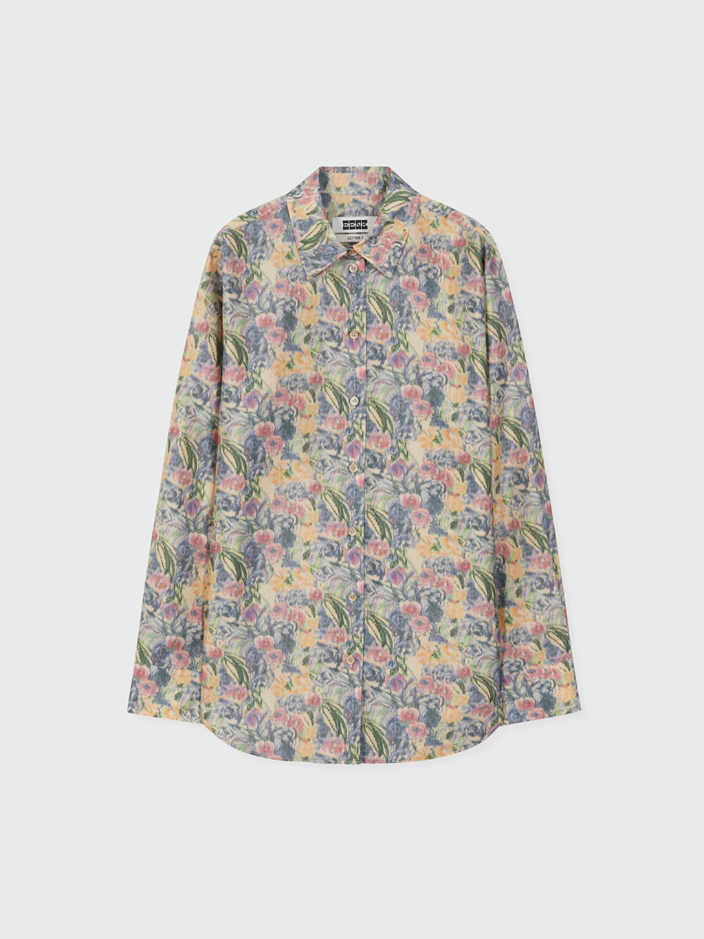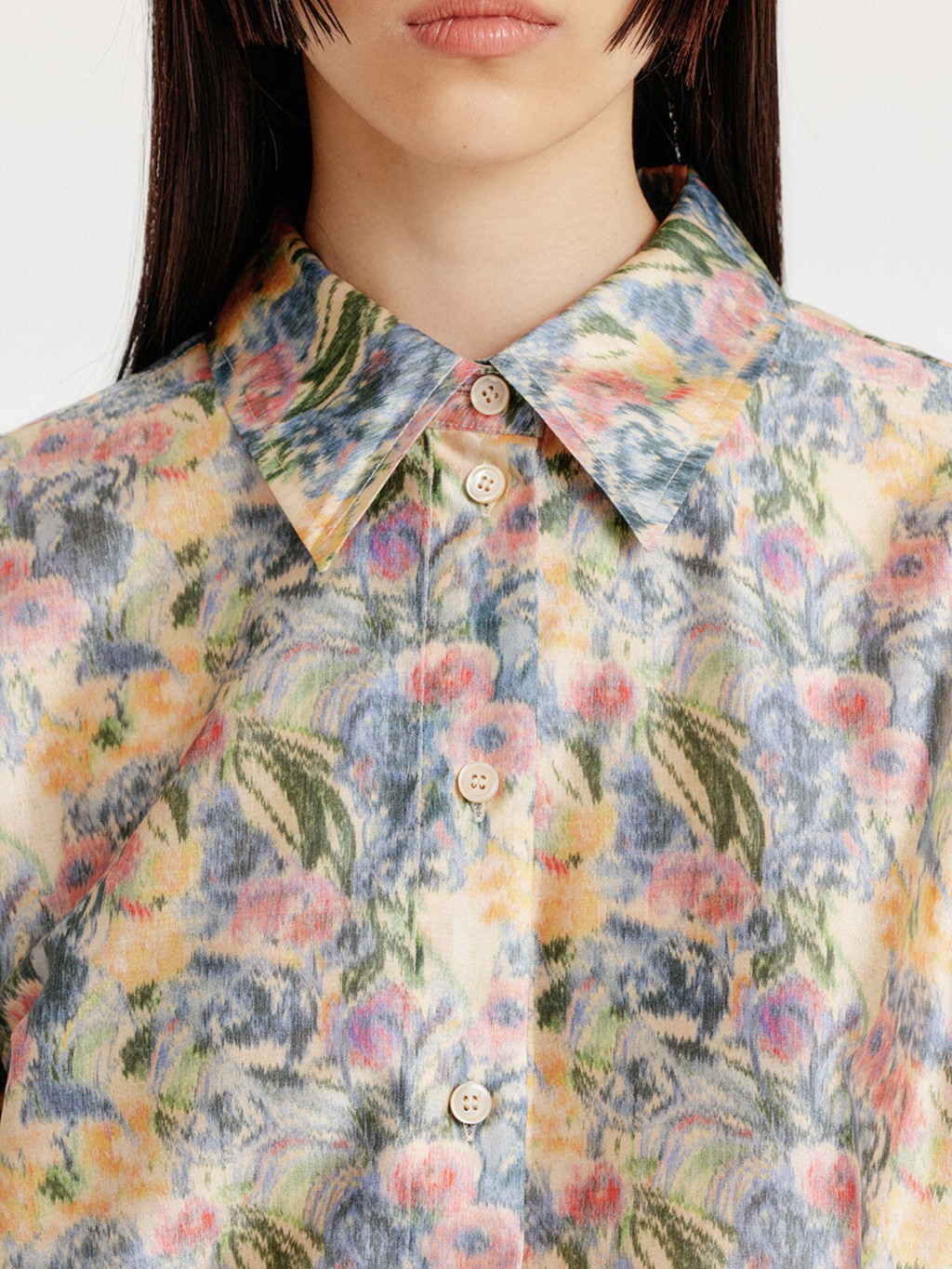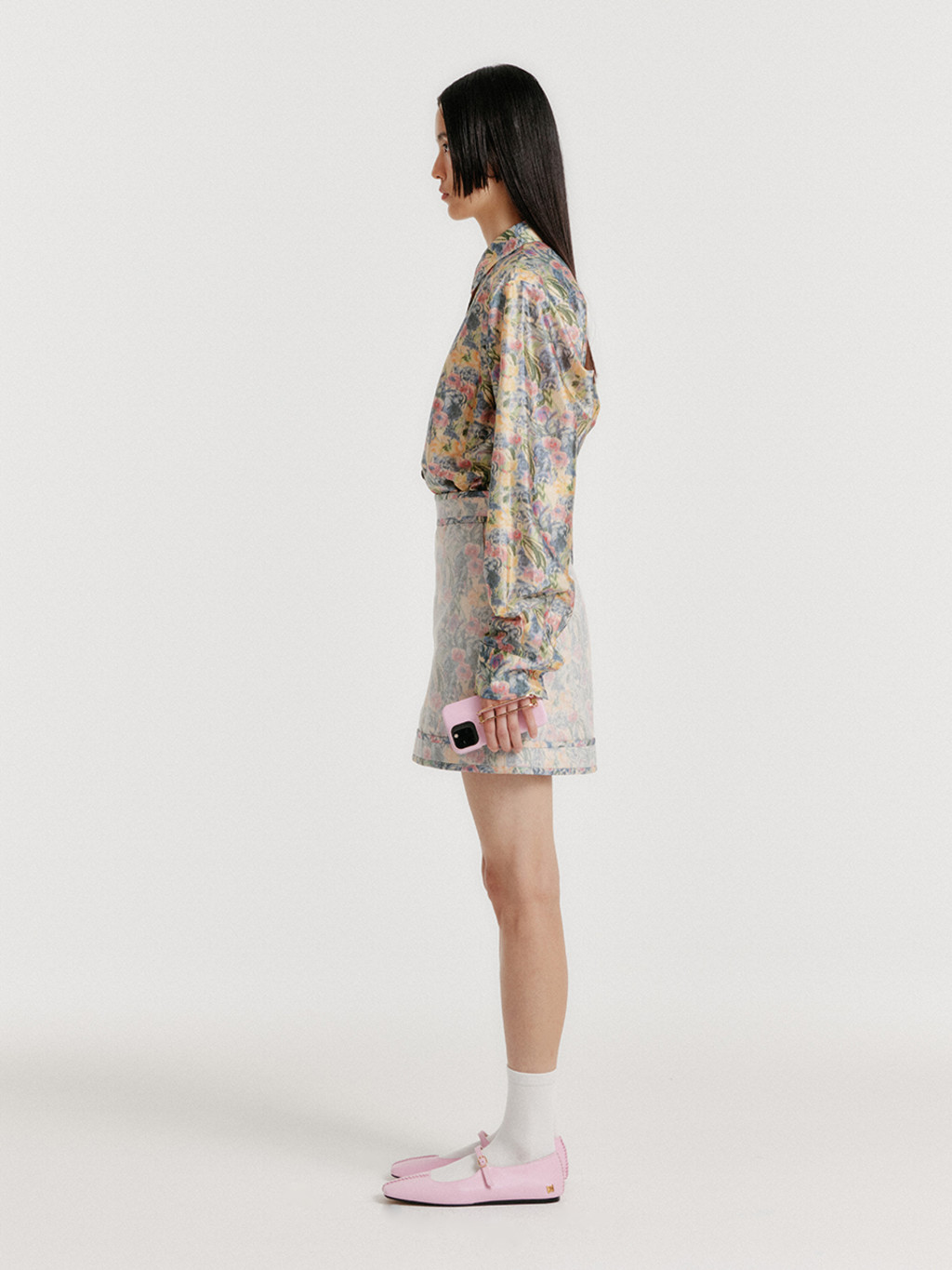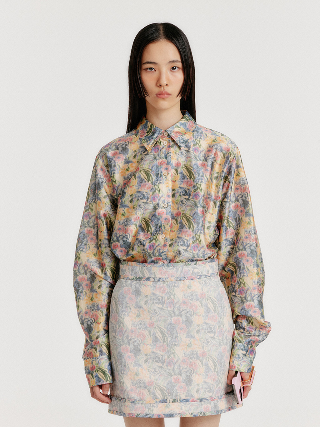 - Floral-patterned silk shirt.